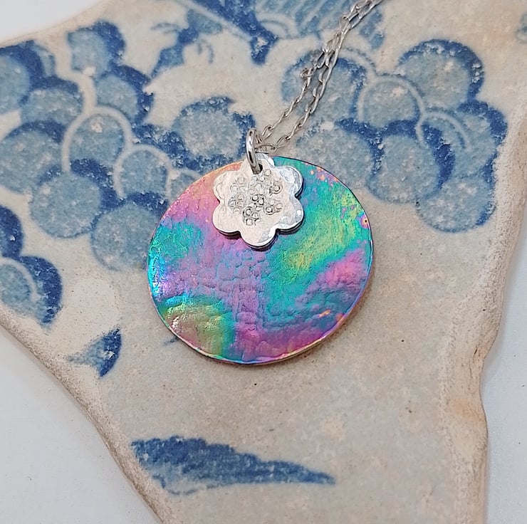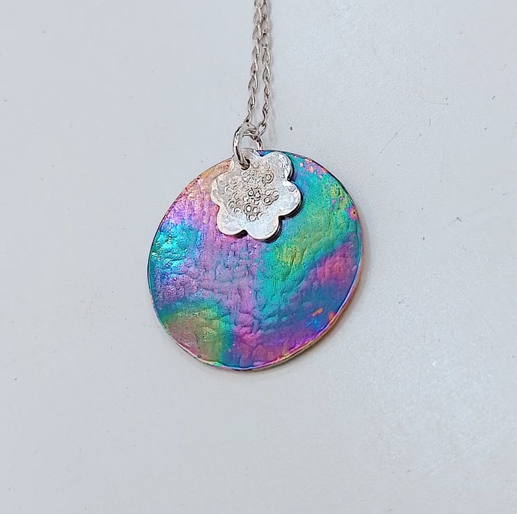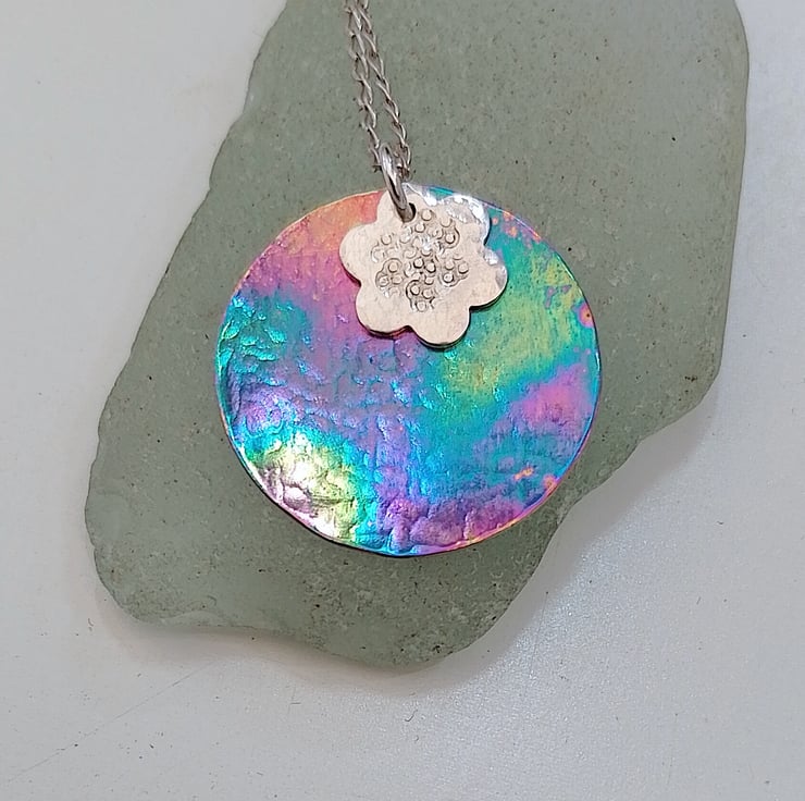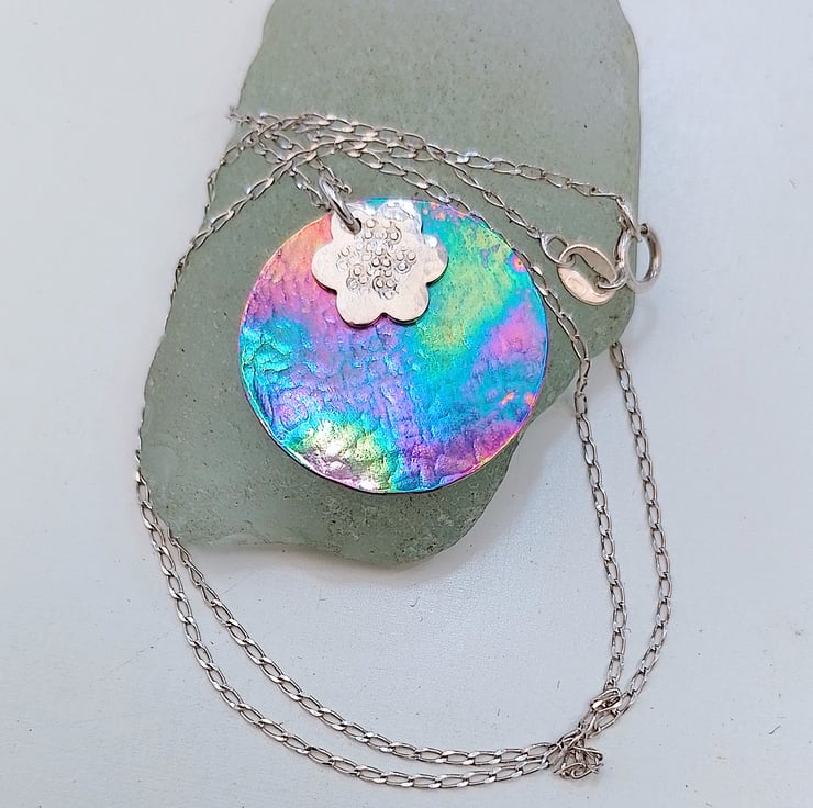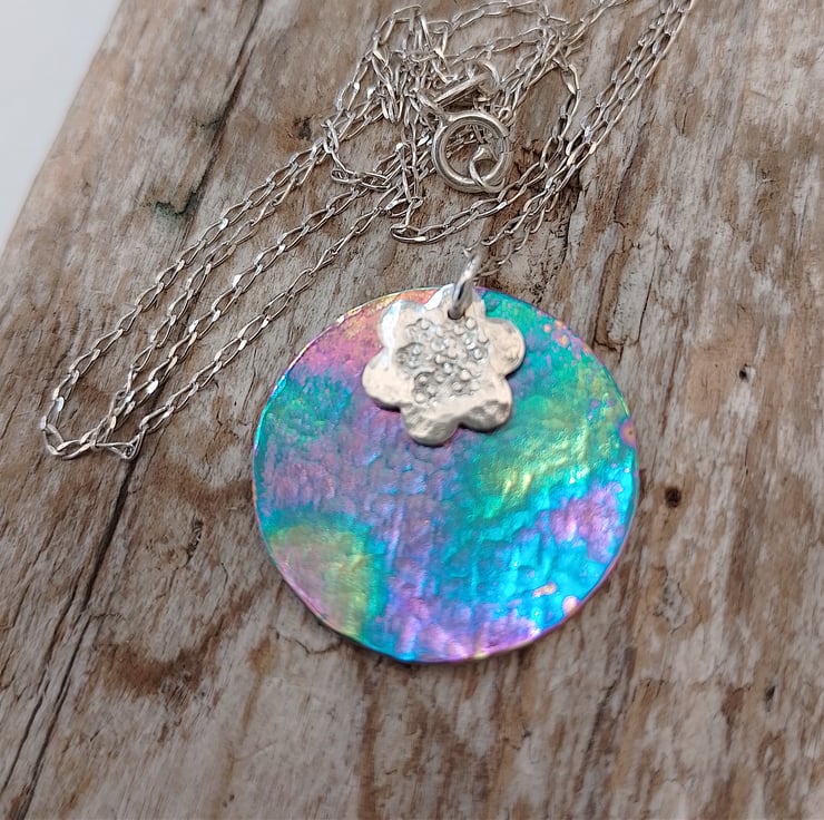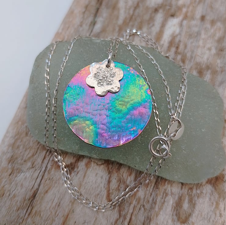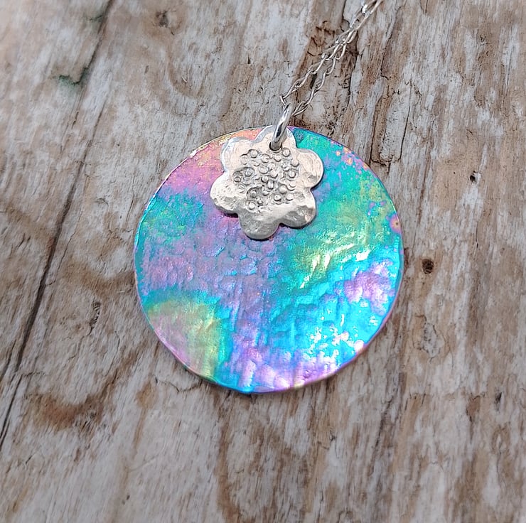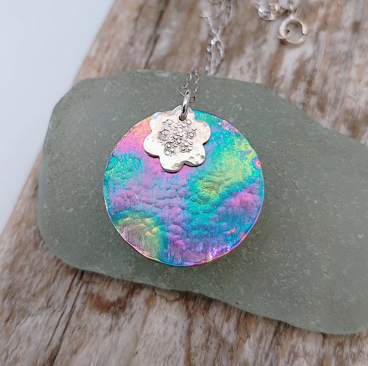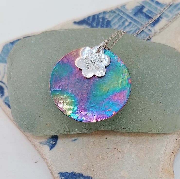 I have handmade this beautiful pendant necklace from a titanium disc which I have hand sawed and carefully finished. I have given it a hammered finish to create a subtle concave shape before colouring. In front of this I have hung a sterling silver flower charm to which I have applied a hammered and hand stamped design.