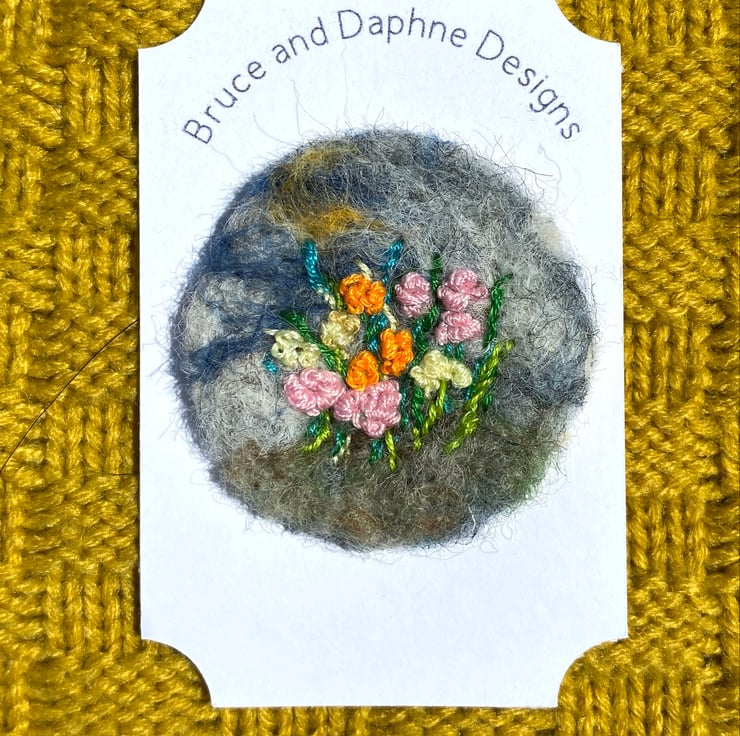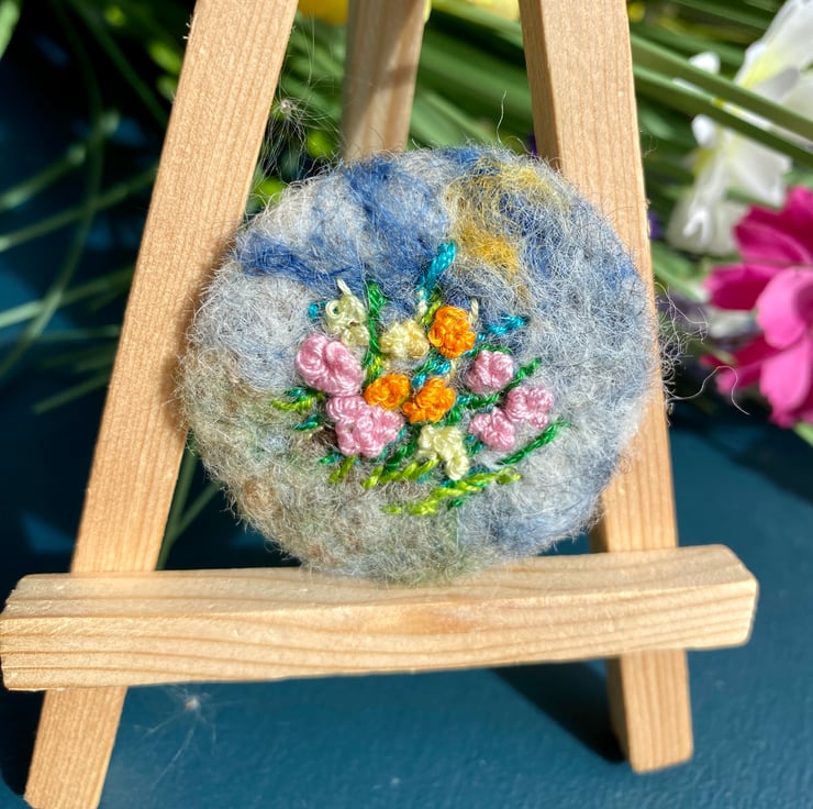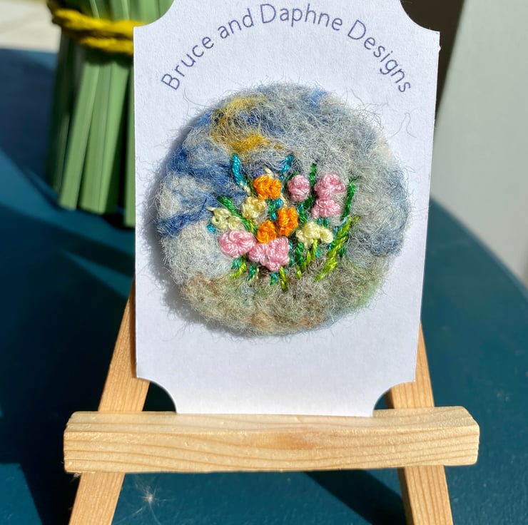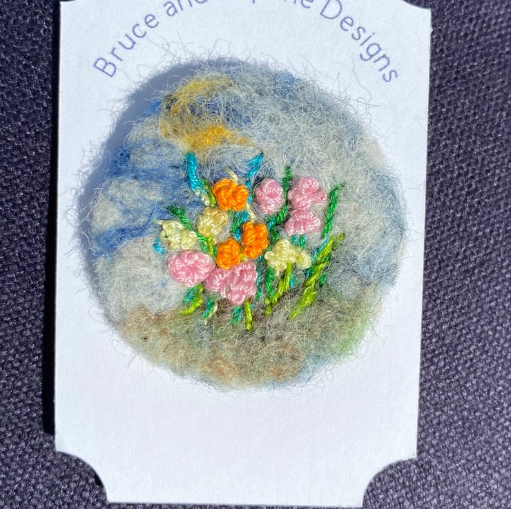A hand needle felted brooch created by blending different pastel colours of merino wool together to create a spring/summer landscape background. Complemented by hand embroidered flowers, backed with a circle of felt.