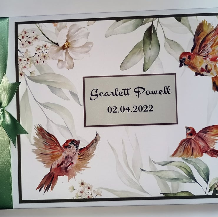 The guest book cover has soft leather finish and contains around 60 high quality acid free paper sheets which is perfect for messages (100 messages at 2 per side) from family and friends, and an everlasting record of the occasion. The guest book measures 21cm x 15.5cm and includes a keepsake box.