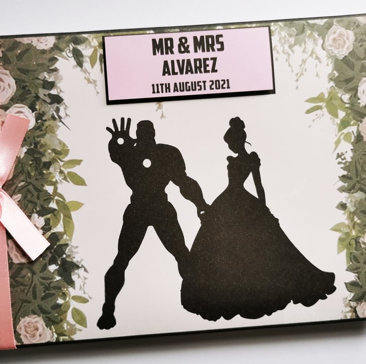 This Wedding Guest Book is decorated with embellishments and a ribbon.