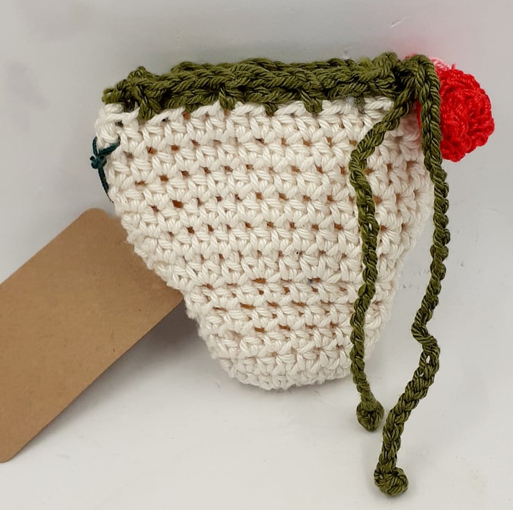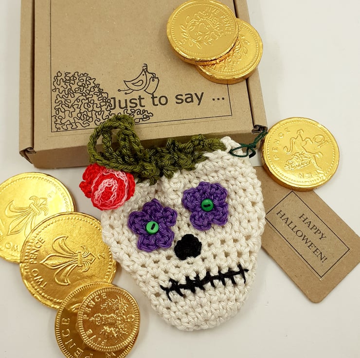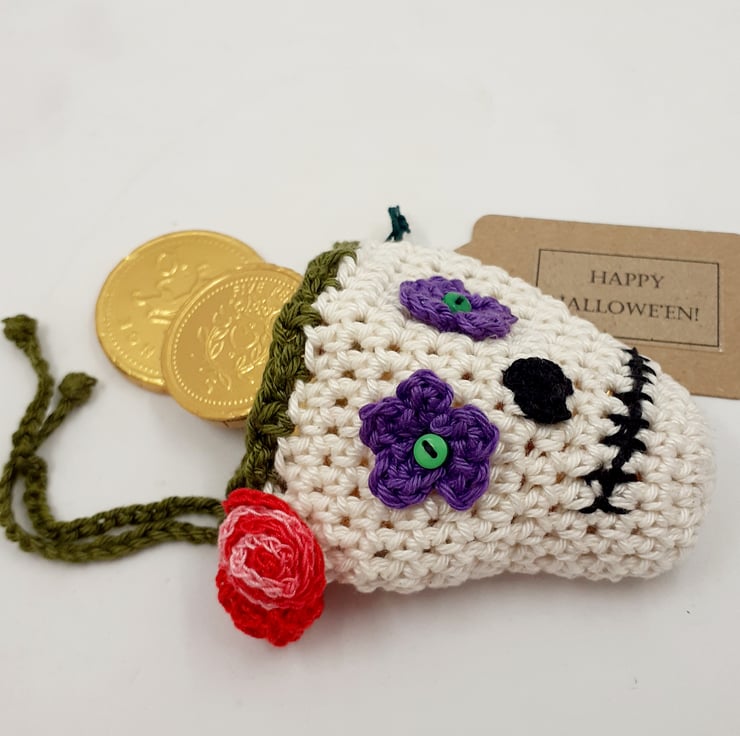 This spooky little pouch is crocheted in cotton and has small.acrylic buttons for eyes. It measures approximately 9cm by 7cm and is tied at the side of the the top of the skull with a crocheted drawstring.