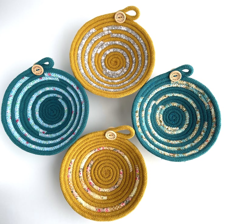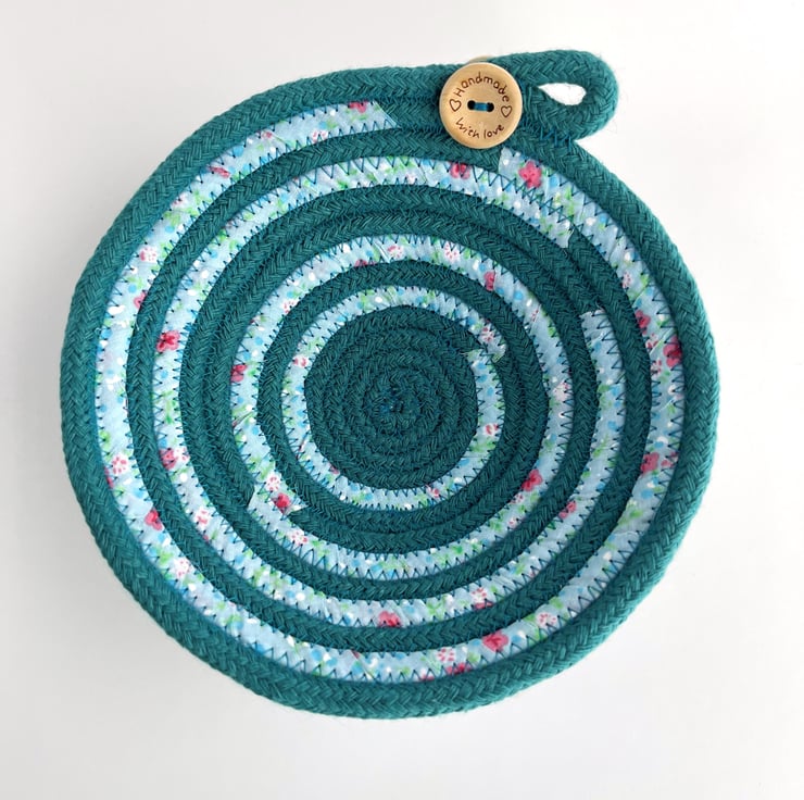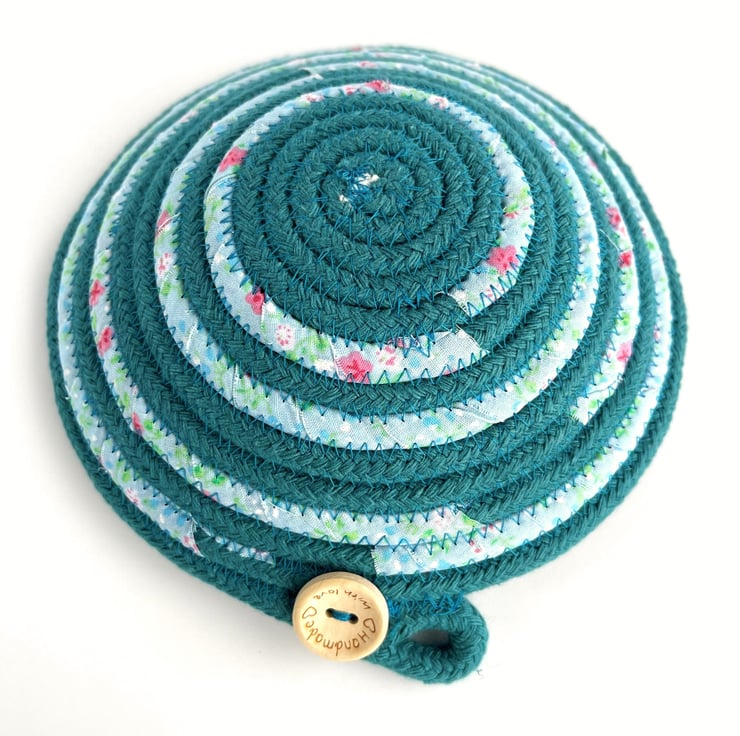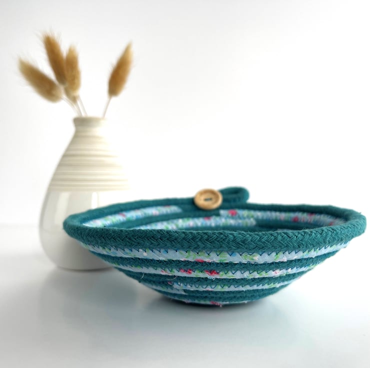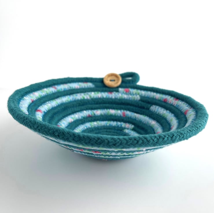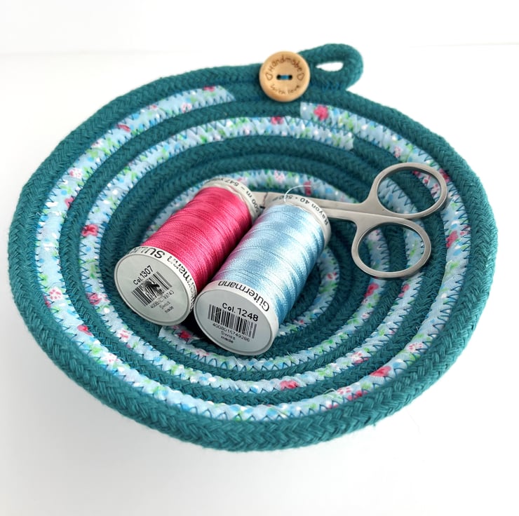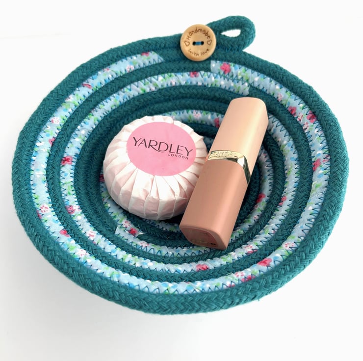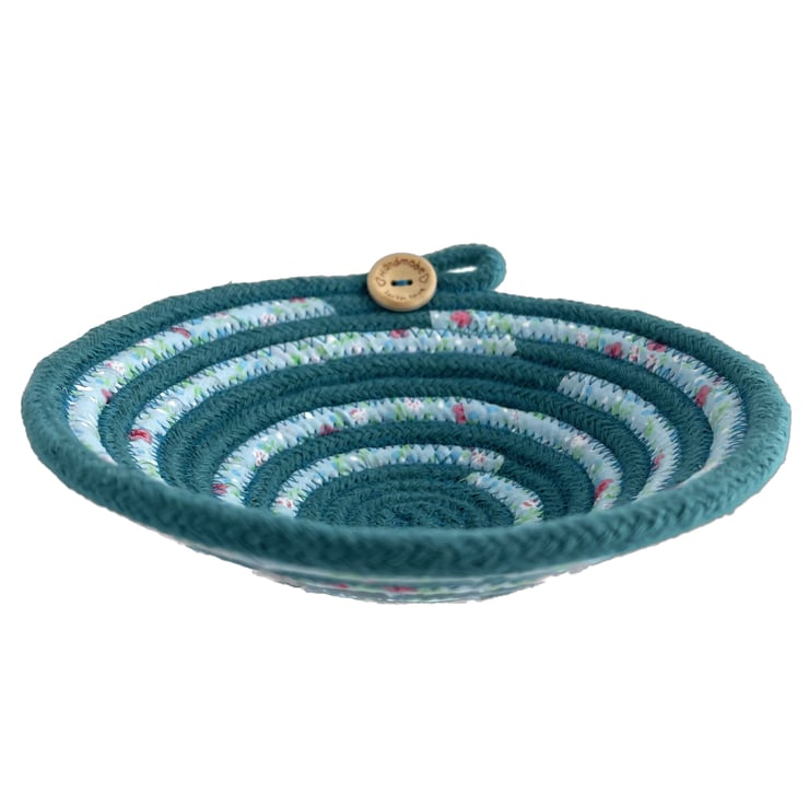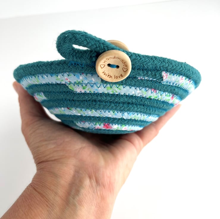 Small coiled rope bowl. This delightful little trinket bowl has been made from teal coloured cotton rope, which has been coiled, whilst being stitched on my sewing machine, and formed into a bowl shape. During the coiling process, I've wrapped strips of fabric around sections of the rope, resulting in a pretty striped effect to the finished dish. The rope is a gorgeous teal colour, and the fabric is a pretty floral print with ditsy flowers in lovely shades of pink, white, turquoise and green on a pale blue background. The dish has been finished with a decorative loop and two wooden buttons, one on the inside and one on the outside of the bowl. The natural wood buttons are inscribed with the words “Handmade with love” and two tiny hearts.