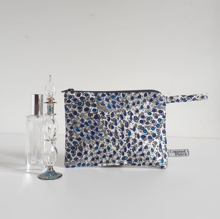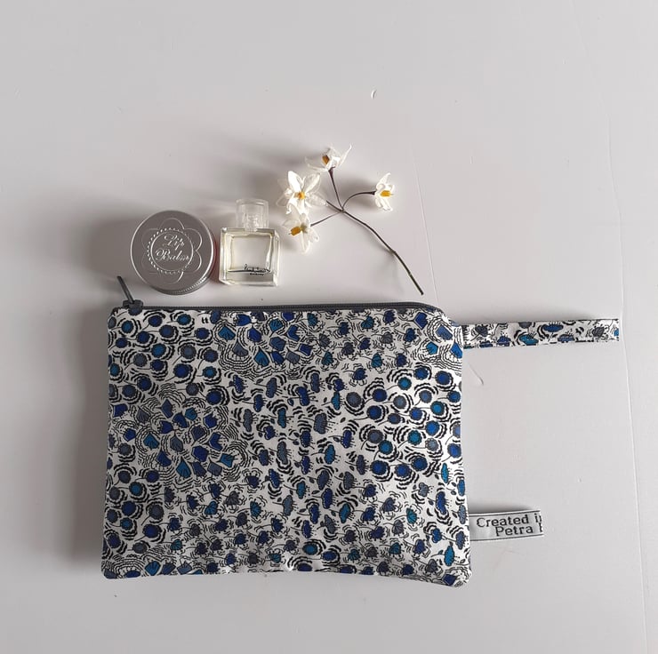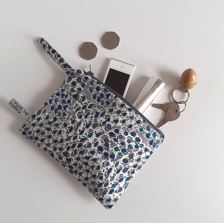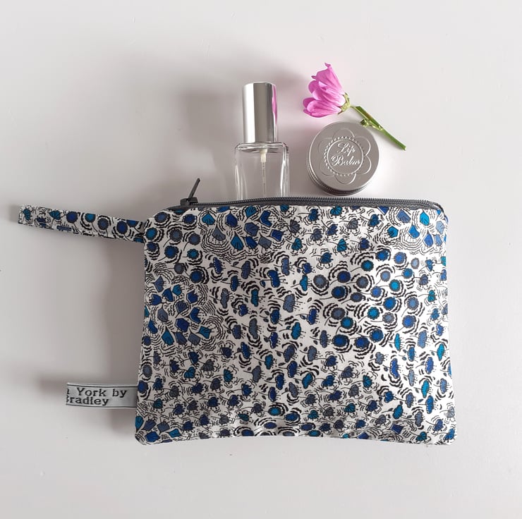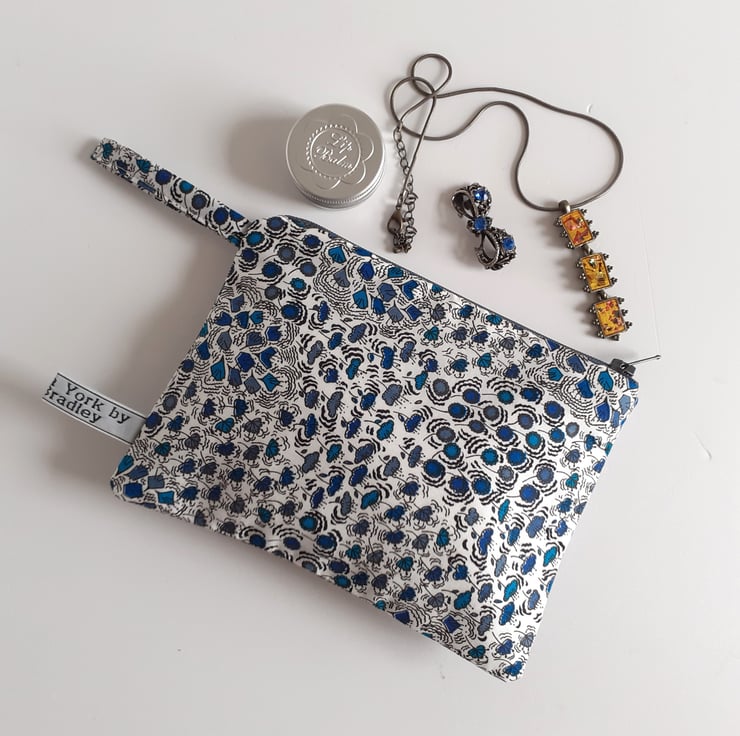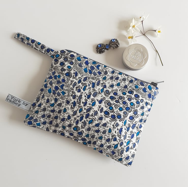 A pretty purse or make up bag in a fresh blue print by Liberty. I love its hand drawn style with its ditsy flower heads swirling in the breeze. Perfect for use as a coin purse, make up bag or simply as a floating pocket to catch the bits and bats that get lost inside your tote bag. This would make a lovely summer Birthday present or a going to Uni present.