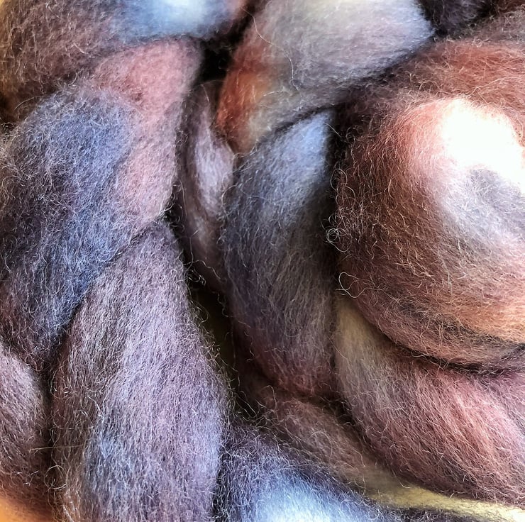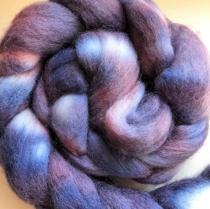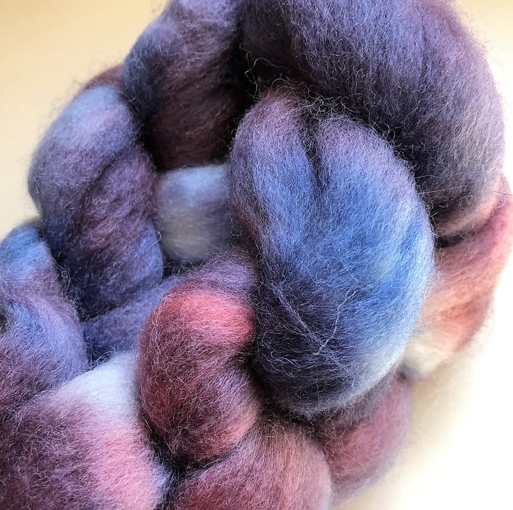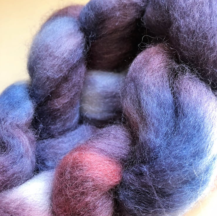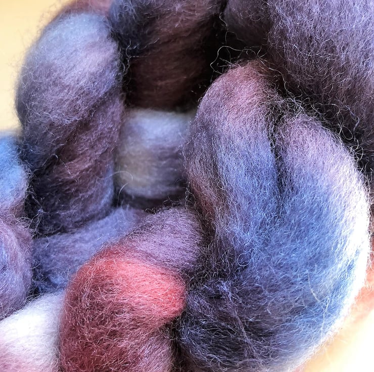 A lovely mix of blues, purples and red in a semi-solid braid. I love this blend for its soft handle when spinning. My own blend of Corriedale, Merino and silk makes the yarn it creates perfect for soft garments next to the skin. I'm sensitive to the scratch that some wool has but I can wear this blend on my neck with no problems. This fibre is perfect for spinning, felting or any variety of crafts.