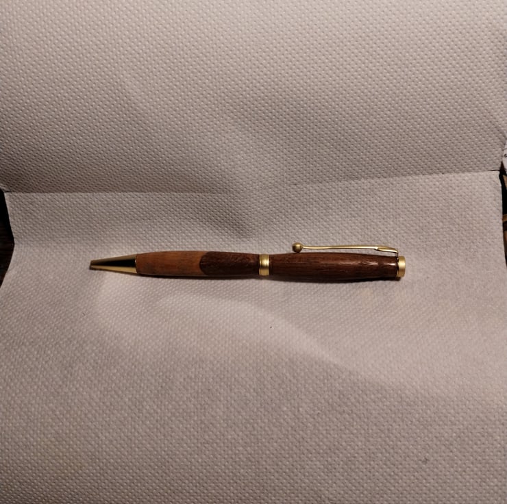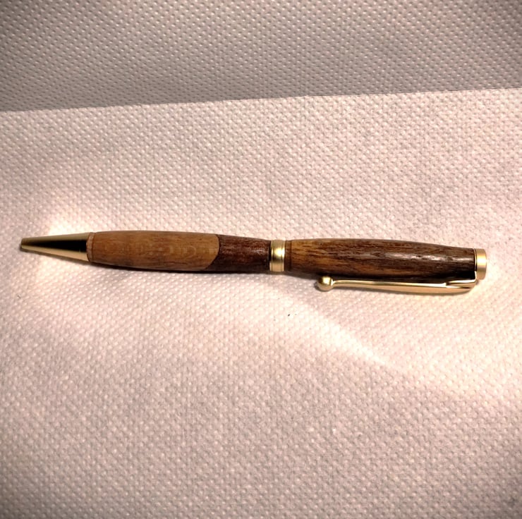 a wooden pen, made using wood using a kit sold by axminster...so spare ink easily purchased on line. They are quirky...my wife calls them "patchwork Pens" as I like to join together different colours of wood.... good fun to make....and hopefully good fun to own.... the last batch got shared out at a family gathering, so this batch is being offered for sale