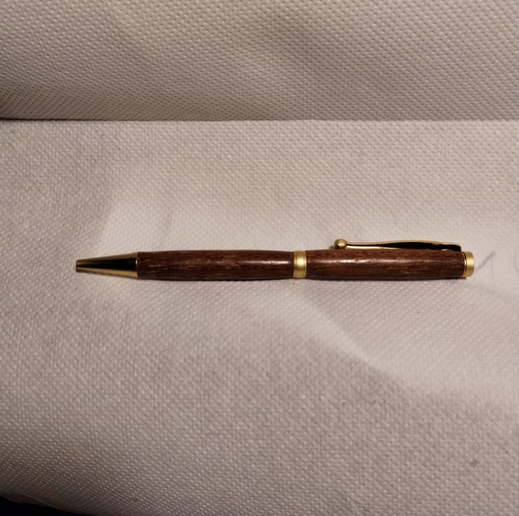 The first three are photos of the pen being offered for sale. The other photos are photos showing the making process, gluing bits of wood, drilling holes then turning on the lathe....finally a coat of button polish, after sanding smooth, then carnauba wax and microcrystalline wax, a quick polish then assembly.... et voila a new pen....its amazing how long it all takes, but quite satisfying....some are more perfect than others.... I don't do the whole "examine with a watchmakers glass" thing, so they are just nice pens with quirky bits....hence the quirky price.... (the top half twists to push the ball point in and out and if you pull the top off, the refill can be screwed out and exchanged)