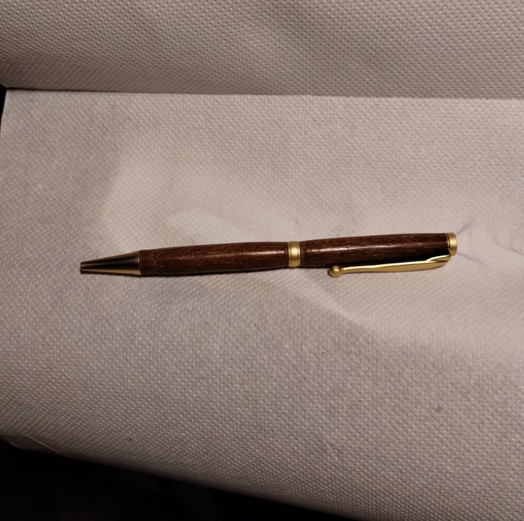 a wooden twist pen made from a kit from axminster. This one is a piece of mahogany type wood from an old piece of furniture that has been re claimed. It has quite a wide open grain that the wax has filled giving a lovely patterner.