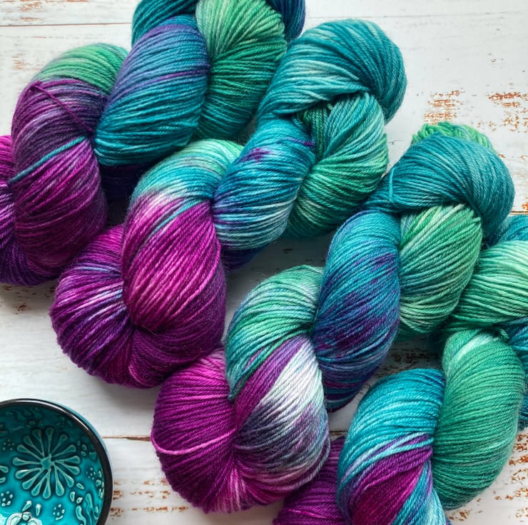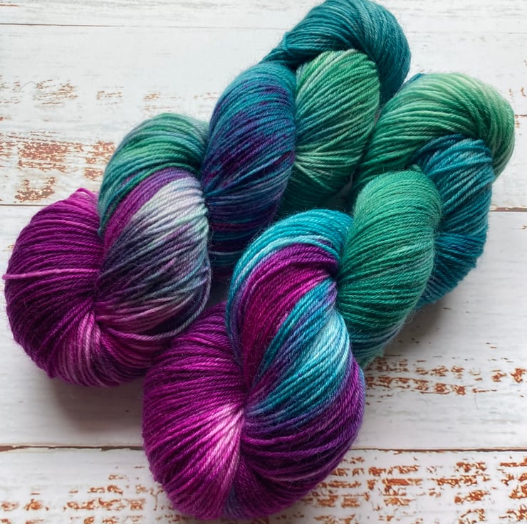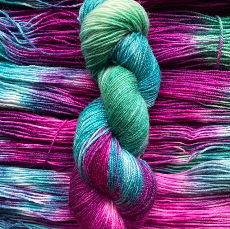 Skein of hand dyed yarn 75/25 merino nylon that has bounce and beauty and great for socks, shawls, mitts or whatever takes your fancy.