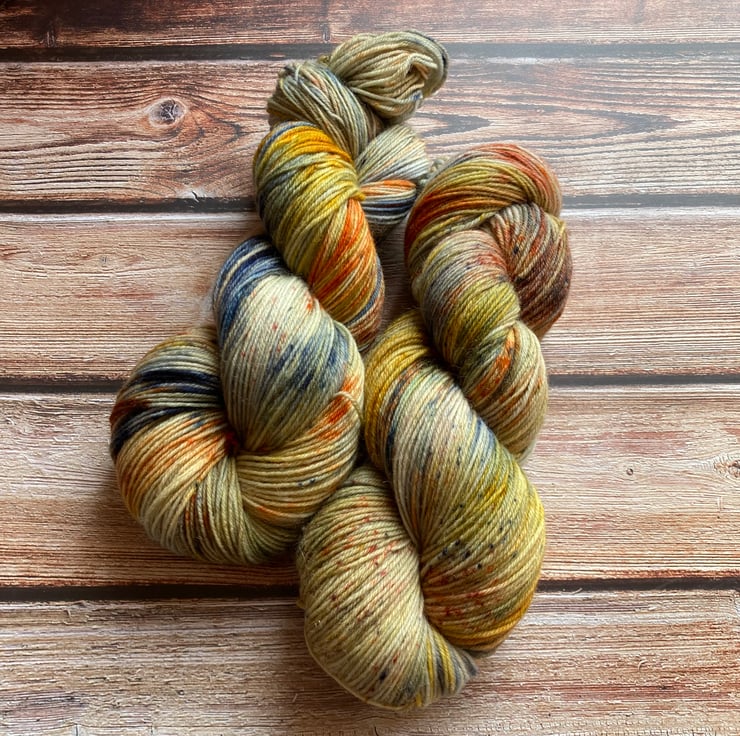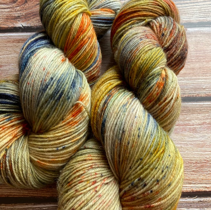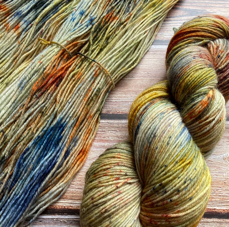 Skein of hand dyed yarn 75/25 merino nylon that has bounce and beauty and great for socks, shawls, mitts or whatever takes your fancy.