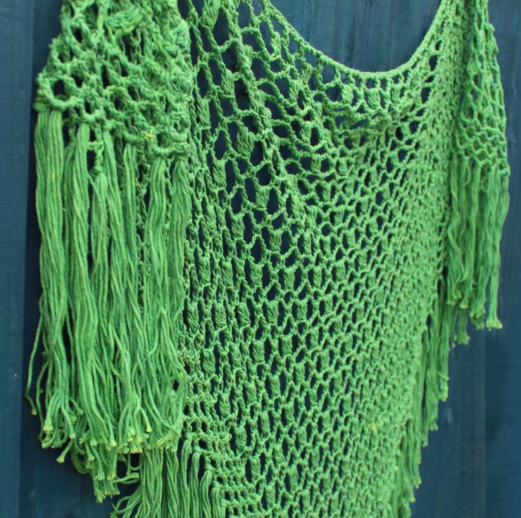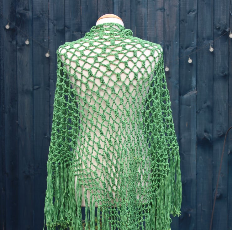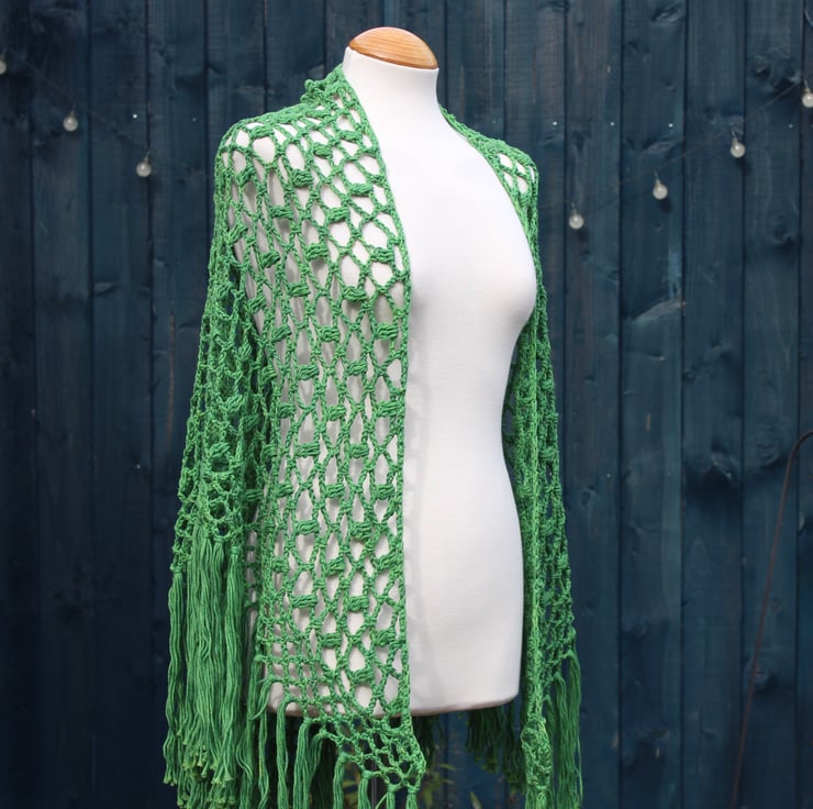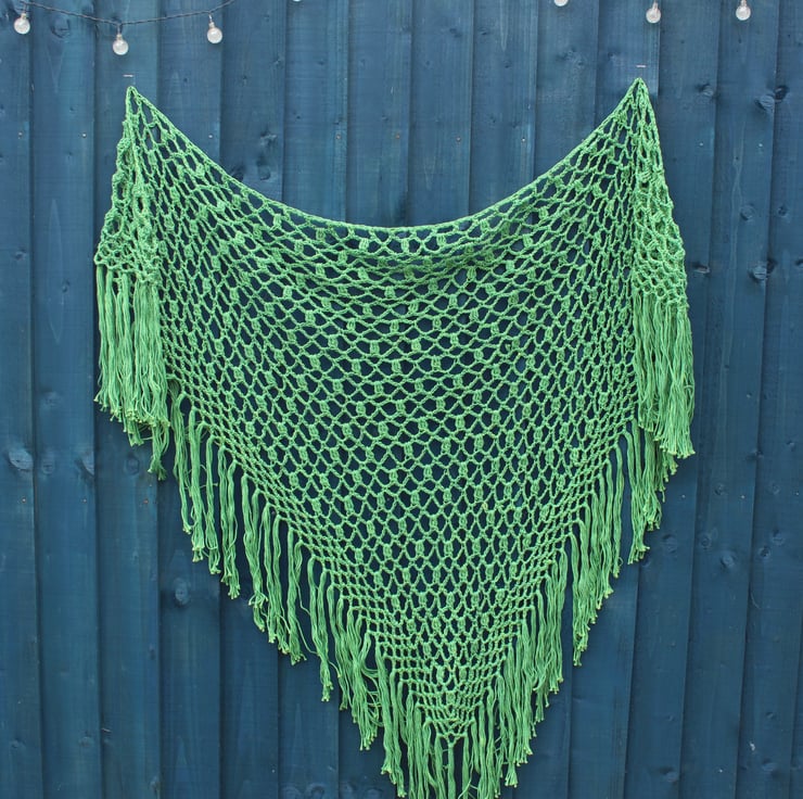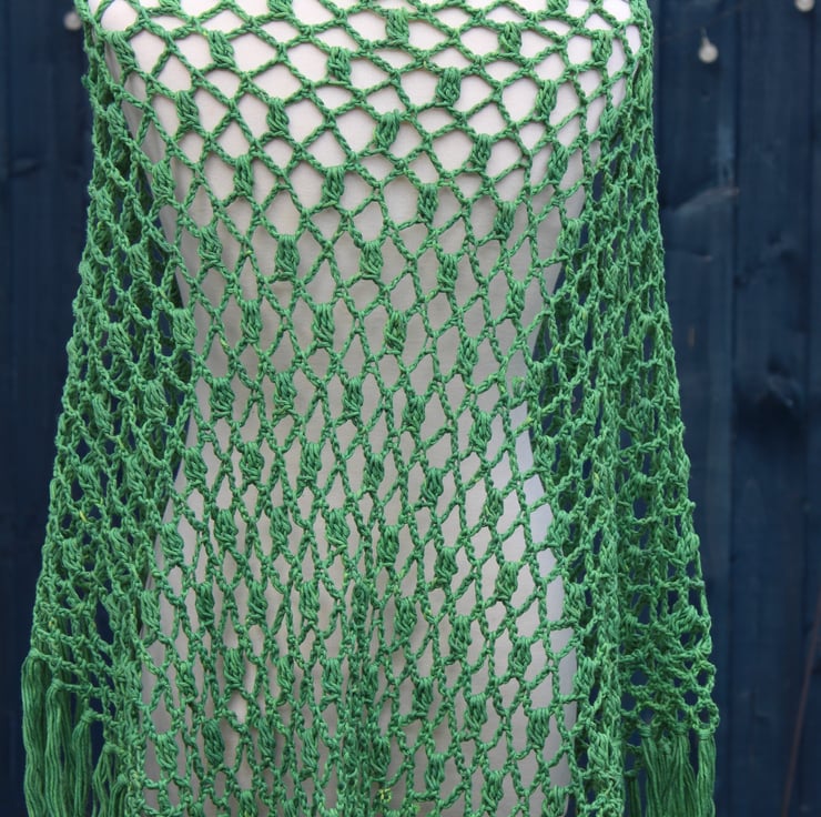 This generously sized fringed triangular crochet shawl, crafted from a timeless pattern dating back to 1976, features a simple all-over lace design and a stylish fringed border. Using a premium, 100% green cotton yarn, this piece offers a delightful combination of softness, drape, and comfort, making it a perfect addition to any wardrobe.