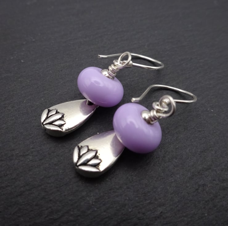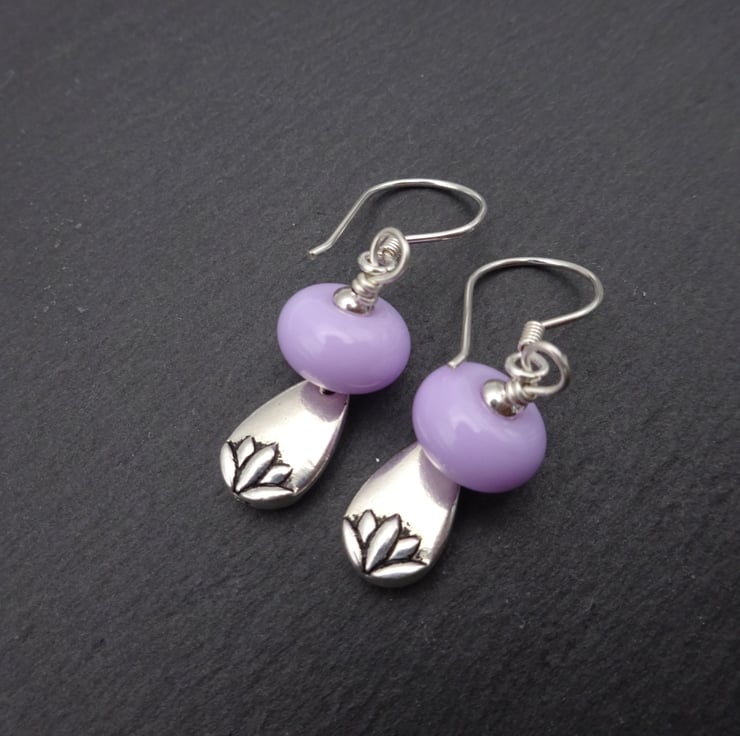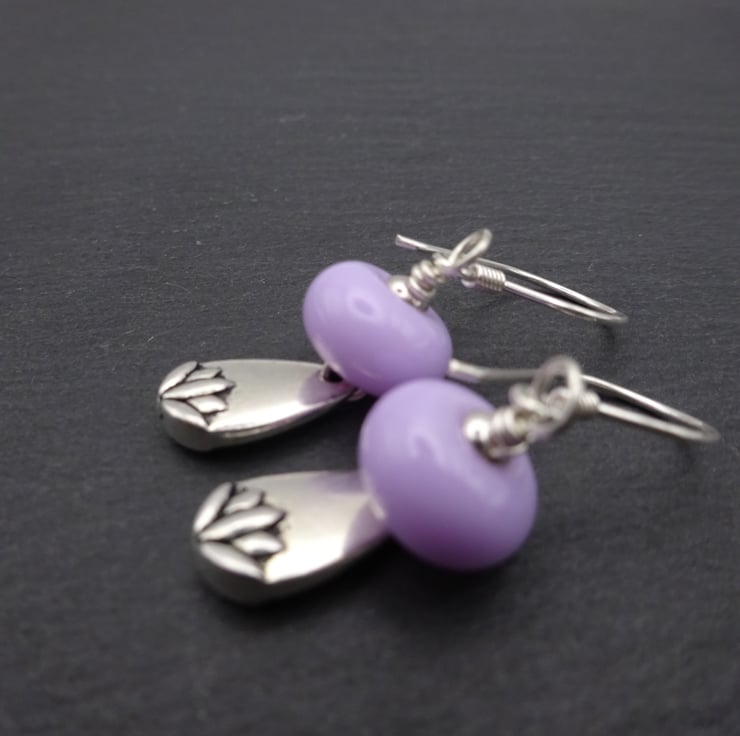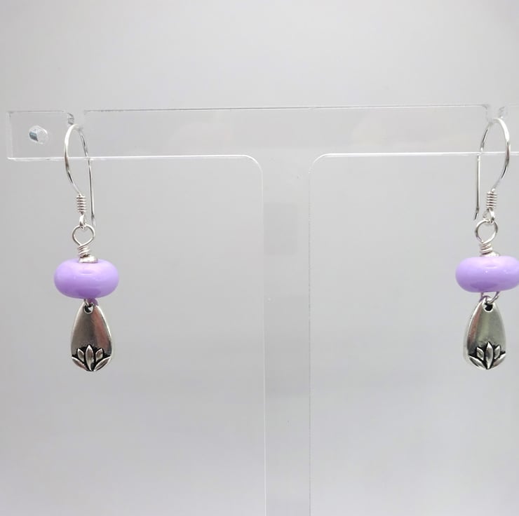 A pair of earrings made with sterling silver ear wires, lampwork glass beads and tierracast lotus charms.