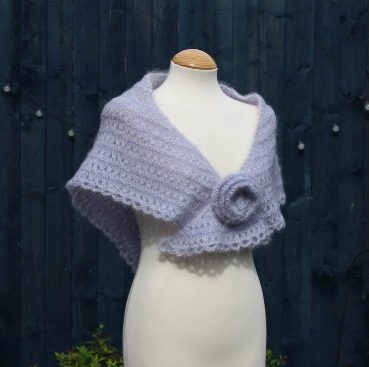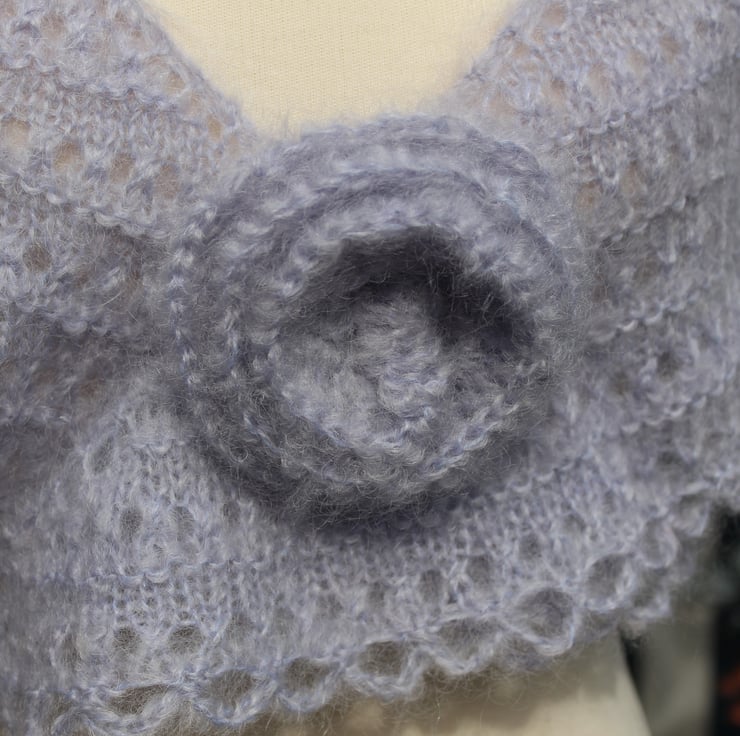This beautiful shawl has been carefully crafted from vintage pale silver grey Mohair yarn, produced in the late 1970s. This versatile piece showcases elegant rows of eyelet lace and garter stitch, beautifully accented by a charming loopy crochet edge. To enhance its appeal, it also includes a lovely crocheted flower brooch made from the same luxurious yarn, making it a truly special accessory!