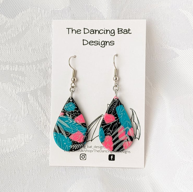 Black teardrop shape earrings with terrazzo style, irregular patches in turquoise and pink, with a silver leaf print design over the top.