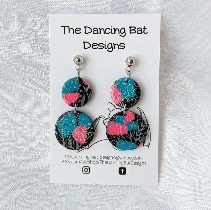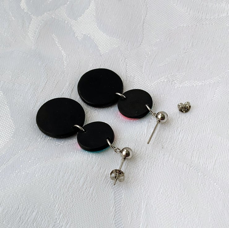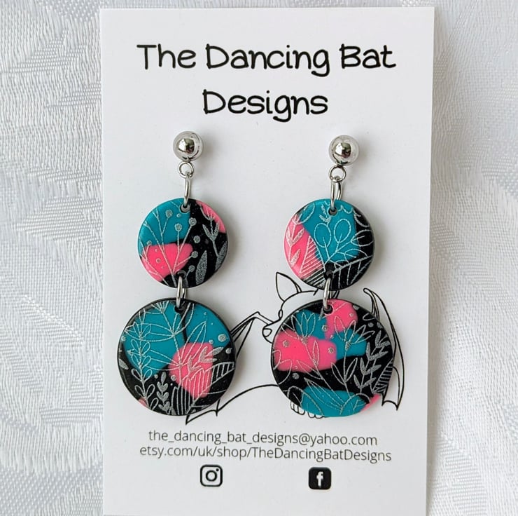 Black circle shape earrings with irregular terrazzo style patches in turquoise and pink, with a silver leaf print design over the top.