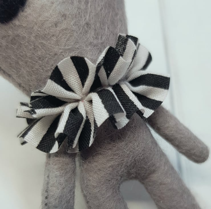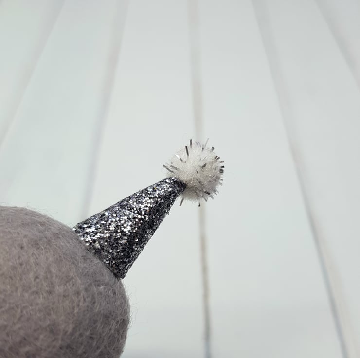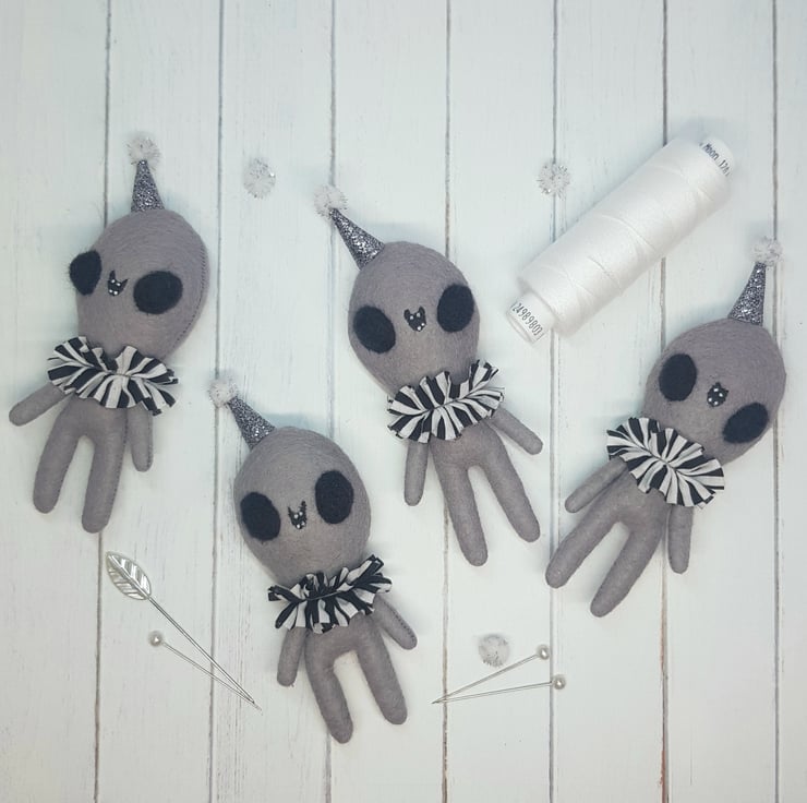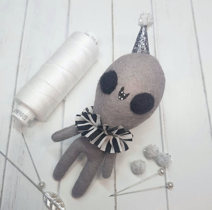 Miniature alien art doll made from felt. Alien wears a hand sewn neck ruffle in black and white stripe and glitter party hat with pom pom on top. Alien has needle felted domed eyes and painted mouth. Alien measures roughly 10.5cm tall and comes with transparent loop hanger. This listing is for one alien chosen at random from those pictured. This is for decorative purposes only and not a toy.