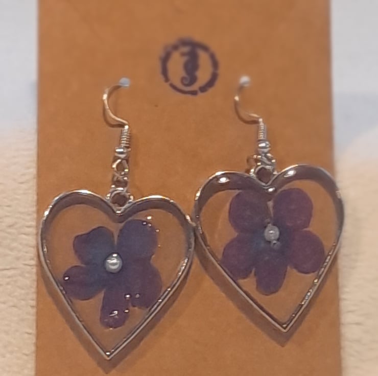 These handmade earrings are heart shaped with silver coloured frames filled with clear resin and a cute purple flower inclusion. They're lightweight and comfortable to wear. Unfortunately the finish on them isn't quite as perfect as we'd like so we've classified them as 'seconds' but they're still beautiful - and lets face it, who doesn't have a few flaws!