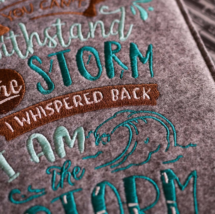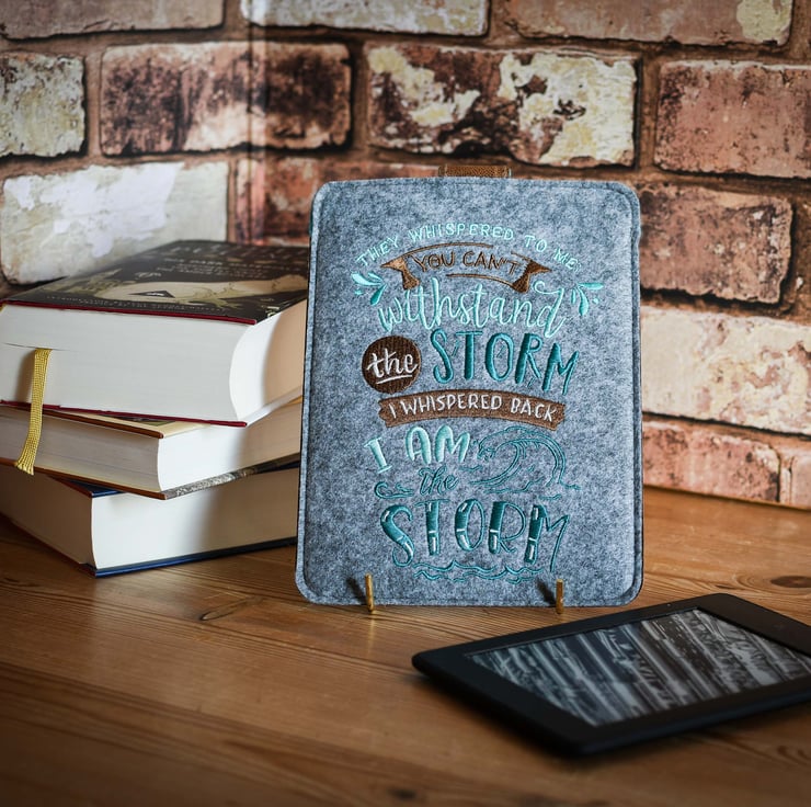 The case is lined with felt and there is embroidery on the front of the case of an inspirational quote saying "They whispered to me, you can't withstand the Storm. I whispered back I Am the Storm".