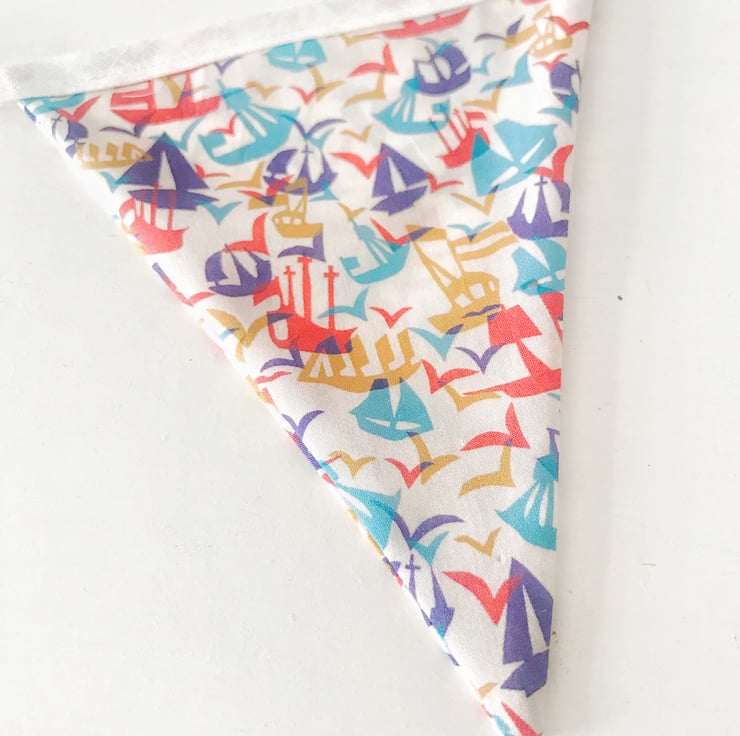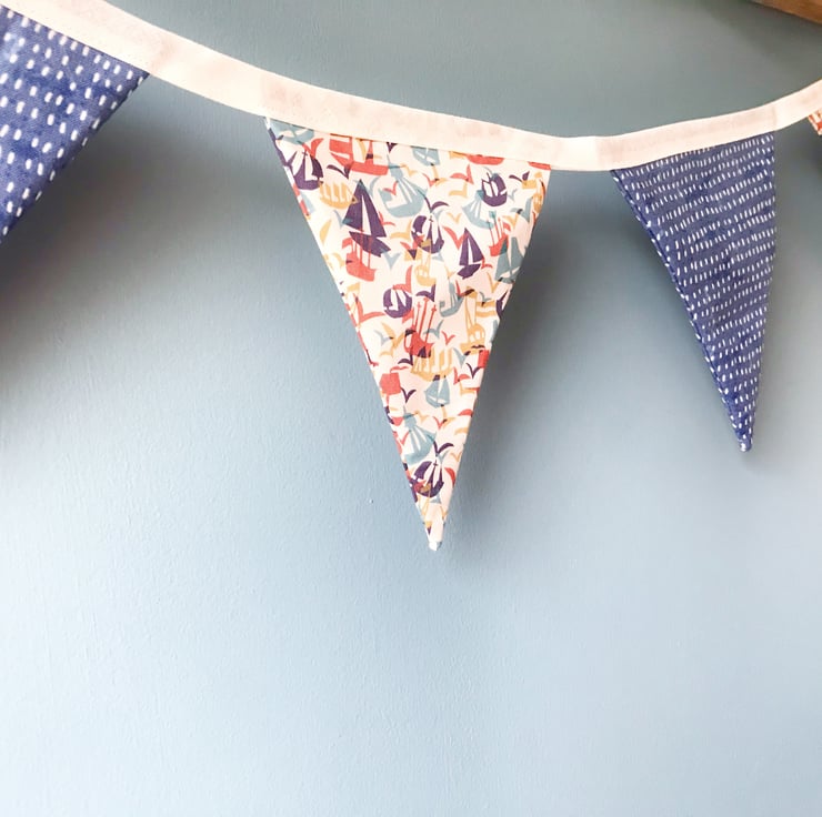 Stylish Liberty sailing ship fabric flags alternated with blue and white spotty fabric flags are strung together white bunting tape to make this gorgeous length of bunting, which would be perfect for a nursery or playroom.