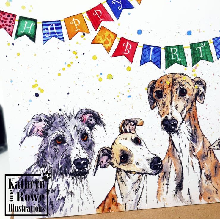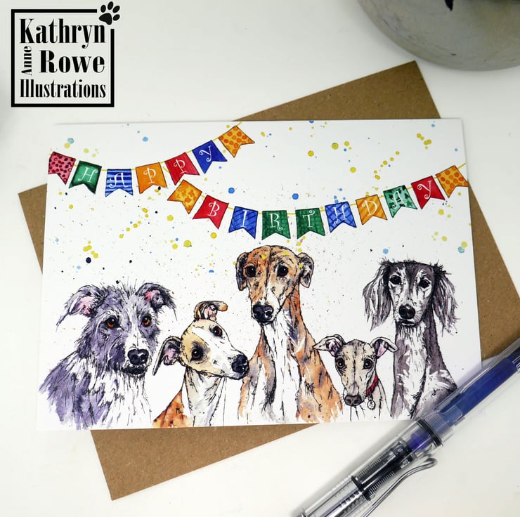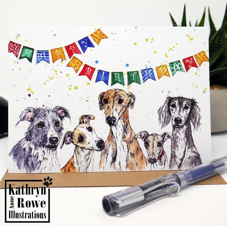 Adorable blank greeting card featuring my watercolour & pen painting of a mischievous group of sighthounds (Lurcher, Whippet, Greyhound, Italian Greyhound & Saluki)!