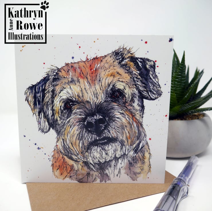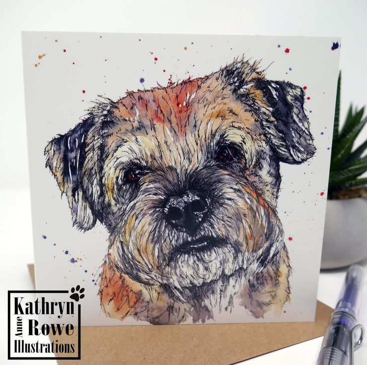 Border terrier adorable greeting card featuring my watercolour & pen painting of a 'Alfie' the cutest Border Terrier