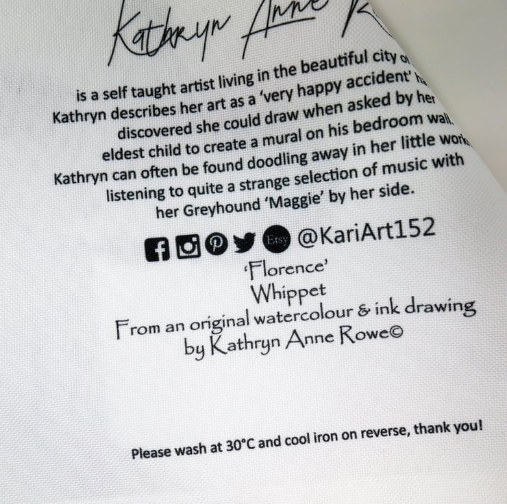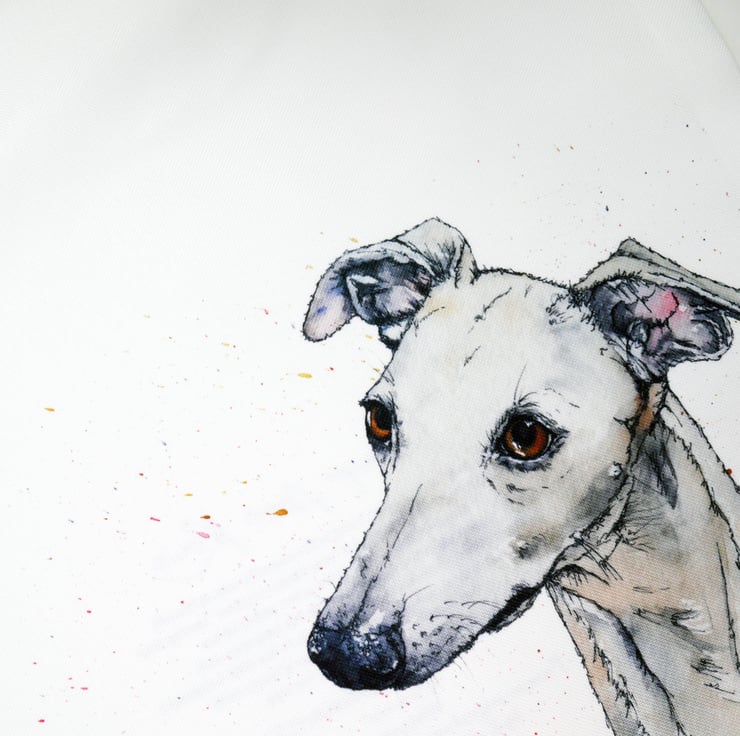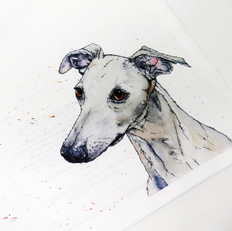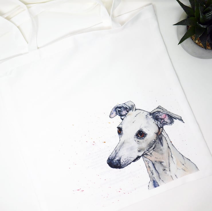 Whippet soft white cotton effect tote bag featuring my watercolour and ink painting of a beautiful 'Florence' the fawn Whippet.