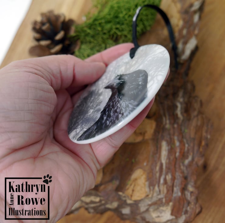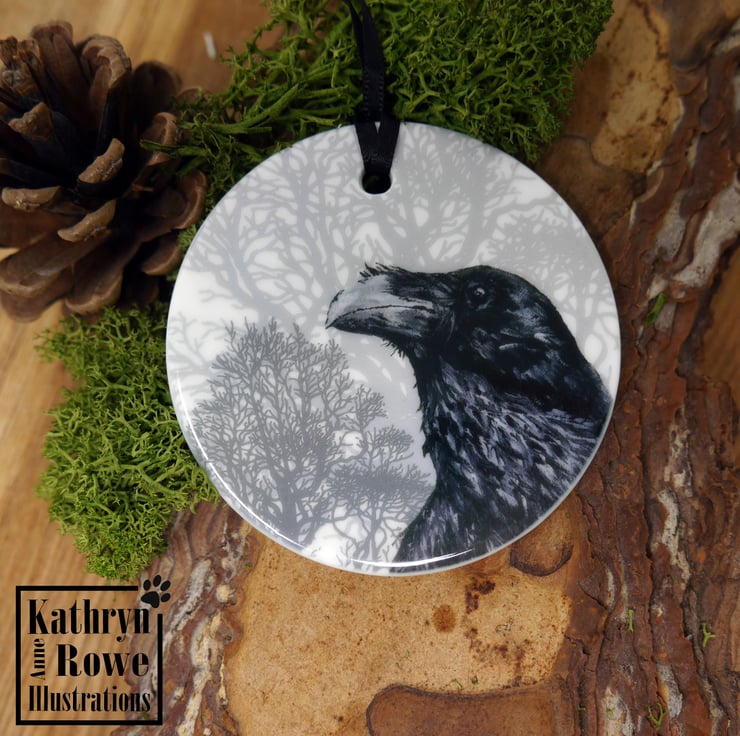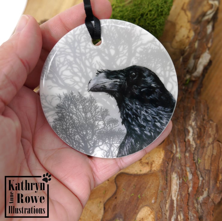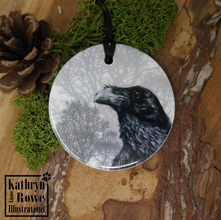 Cute but spooky delicate ceramic circular hanging decoration featuring my acrylic painting of a watchful Raven.