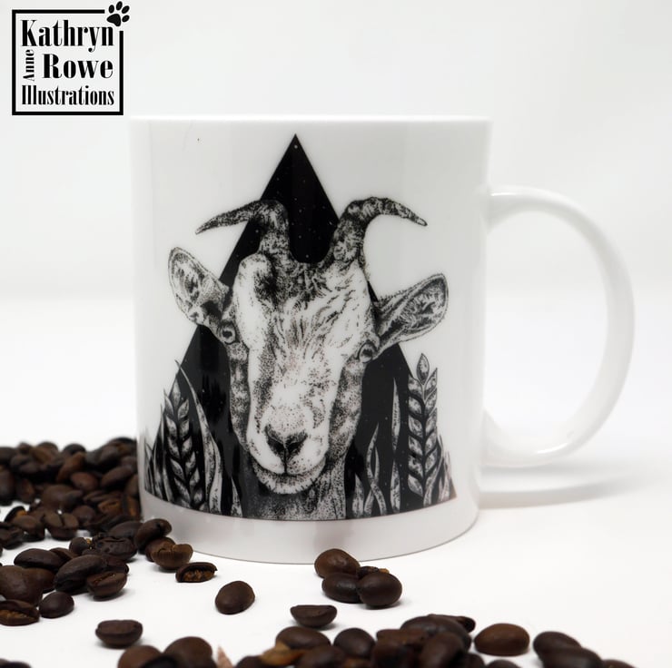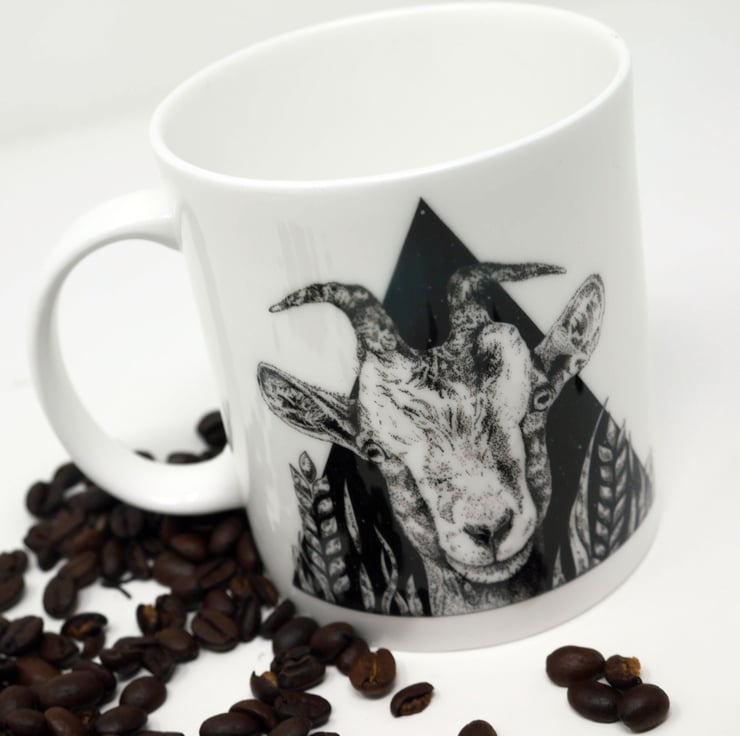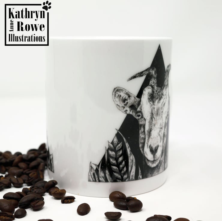 A stylish 15oz Bone China mug featuring my dot work pen & ink drawing of a cheeky goat having too much fun in the cornfield!