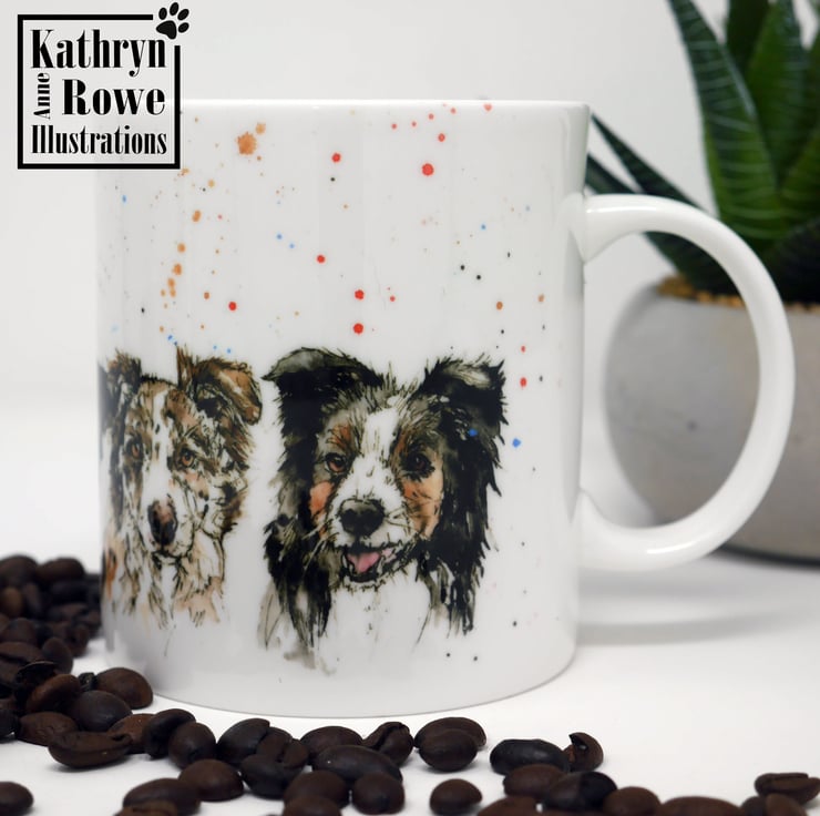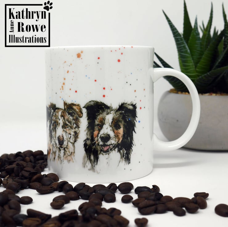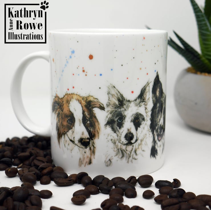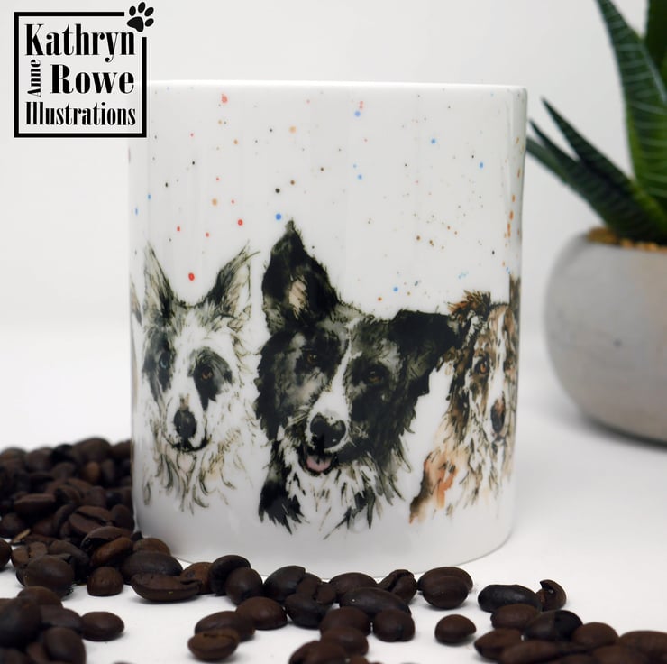 Border Collie 15oz Bone China mug featuring my watercolour & ink painting of 5 cheeky Border Collies all looking for their ball!