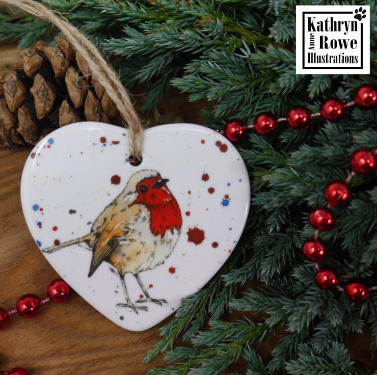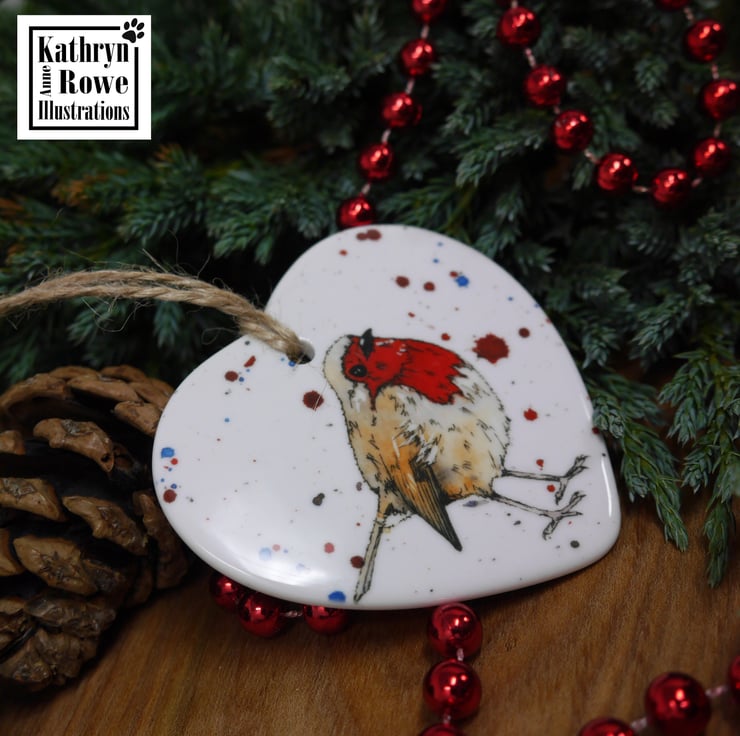 Cute, delicate ceramic heart hanging decoration featuring my watercolour & ink painting of a lovely little Robin