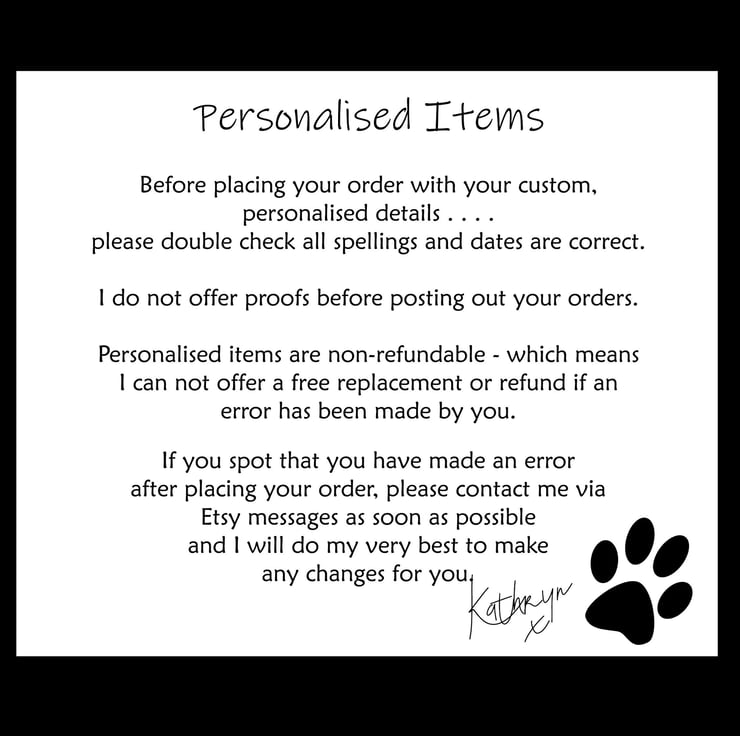 Unless faulty, the following types of items are non-refundable: items that are personalised, bespoke or made-to-order to your specific requirements; items which deteriorate quickly (e.g. food), personal items sold with a hygiene seal (cosmetics, underwear) in instances where the seal is broken; digital items.