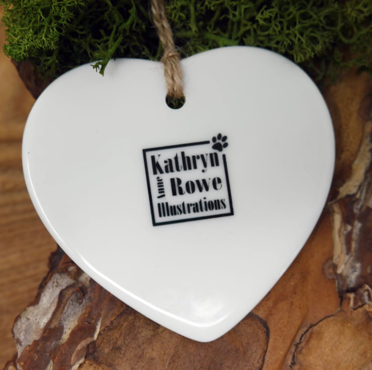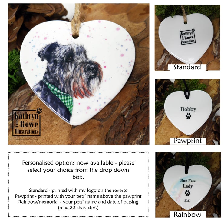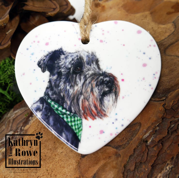 Miniature Schnauzer delicate ceramic heart hanging decoration featuring my watercolour & ink painting of adorable, cheeky 'Buster' the Miniature Schnauzer.