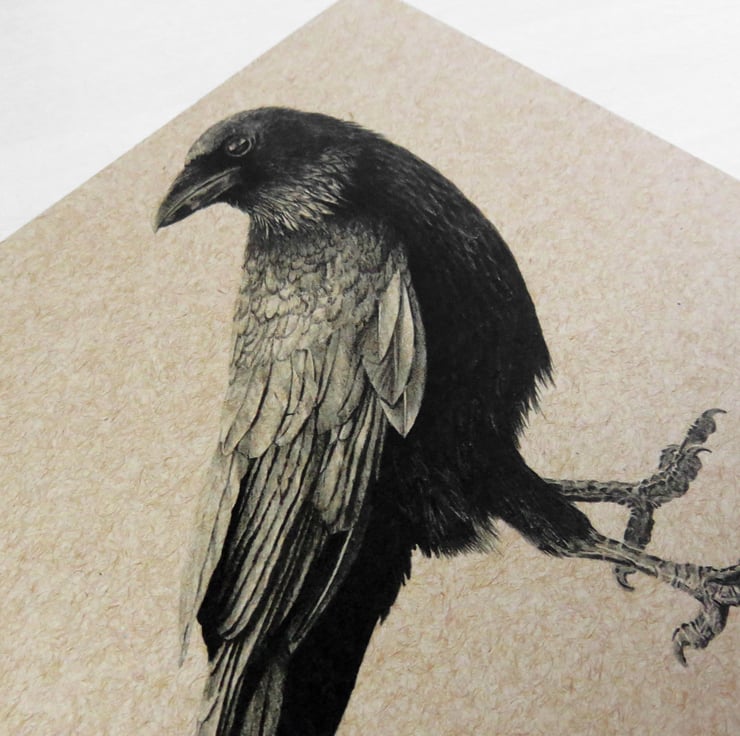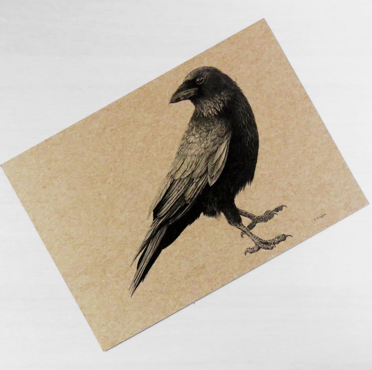 This is one of a set of three larger crow drawings I produced as part of my Courting Crows series, a project undertaken to study the local corvid species. I wanted to experiment with print options for these and so I've done my first run on natural recycled card which I think gives the prints a lovely rustic/aged feel.