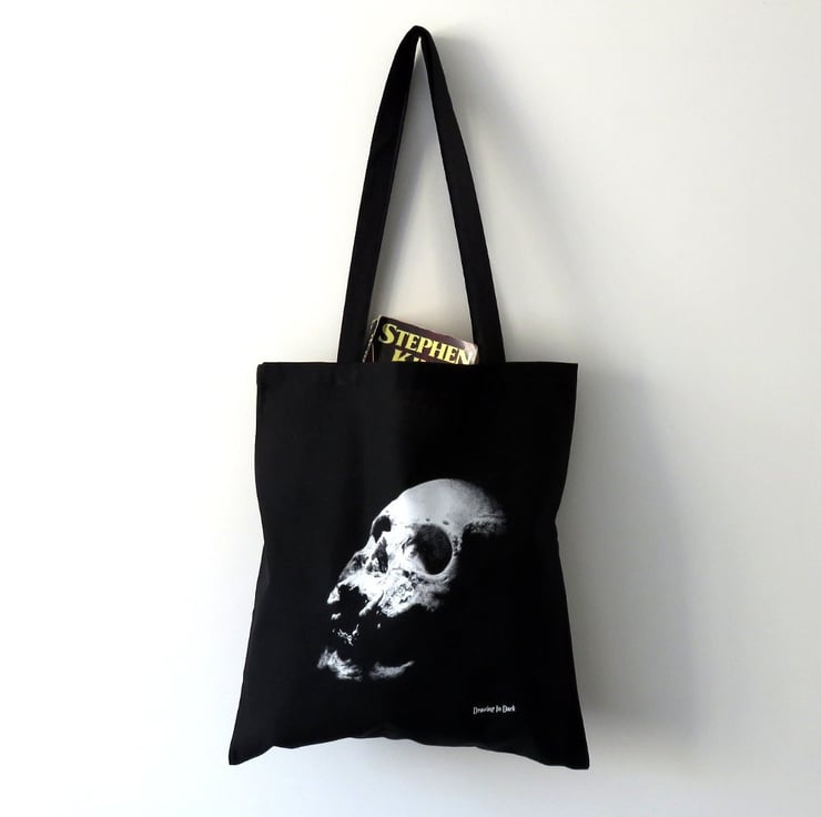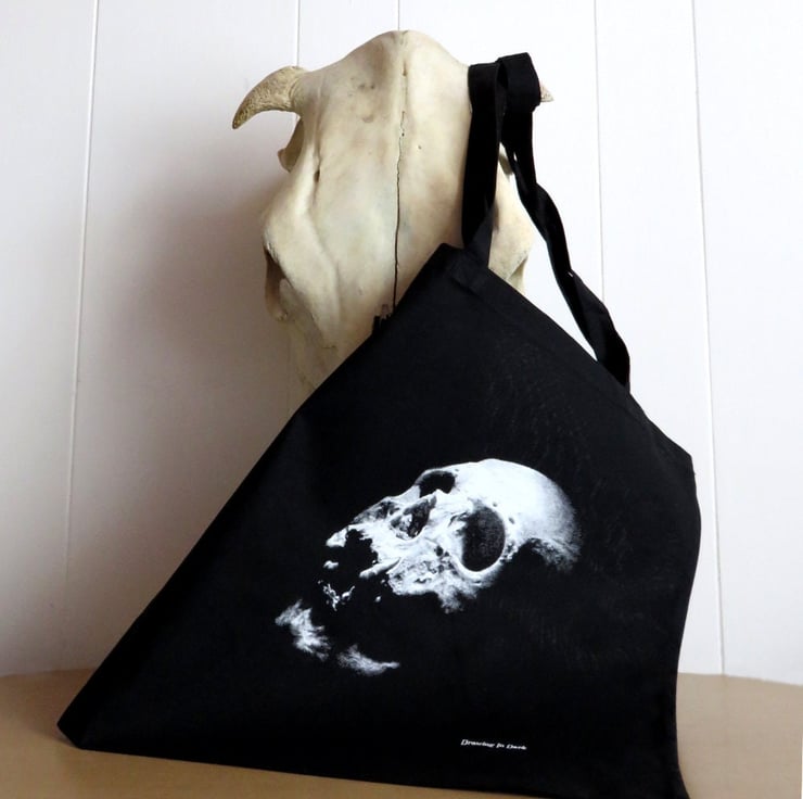 Human skull print gothic tote bag, from my original charcoal drawing - makes a great alternative Christmas present. The bag is tough cotton, with long handles so it can be worn over the shoulder for convenience and comfort.
