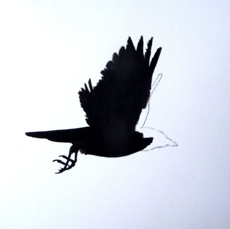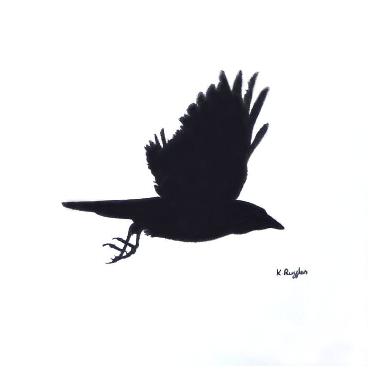 A lovely image of a crow in flight, I took the photo this drawing was done from when I lived in Cornwall, creating my first crow collection. These little chaps have proved so popular I am still working from those same images, producing a slightly different drawing each time. Reusing photographs in this way allows me to continue offering originals at entry level prices.