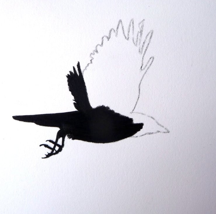 A crow in flight, both wings outstretched, charcoal pencil drawing on fine art paper. Small but perfectly formed, would make a great gift for bird lovers and fans of grown up gothic.