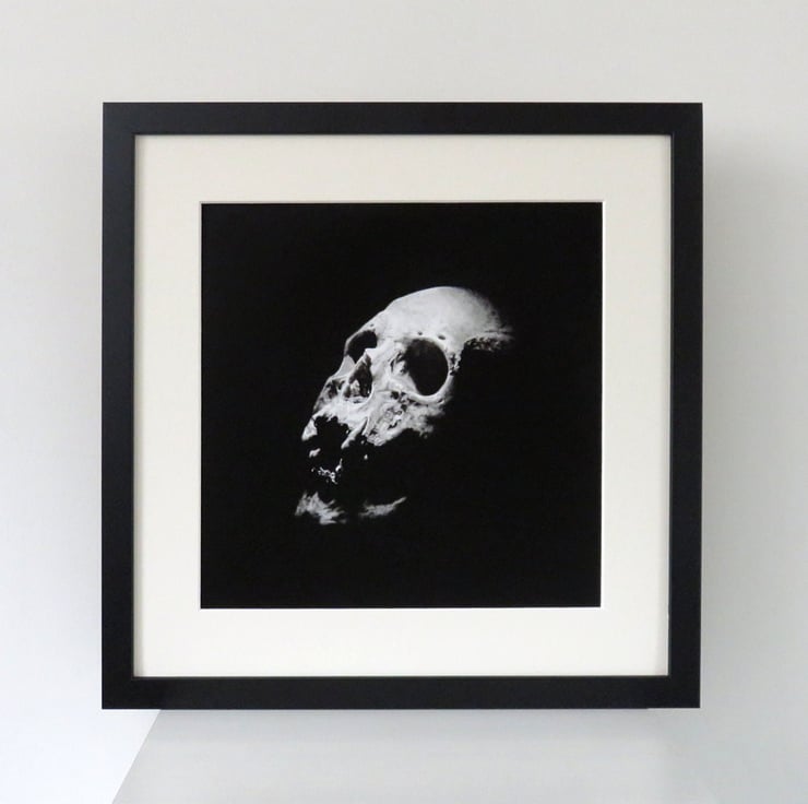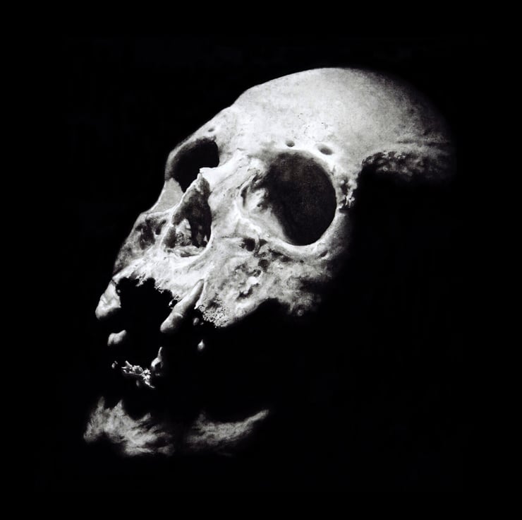 Charcoal pencil drawing of a real human skull reproduced as a stunning fine art print. A sophisticated gothic memento mori.