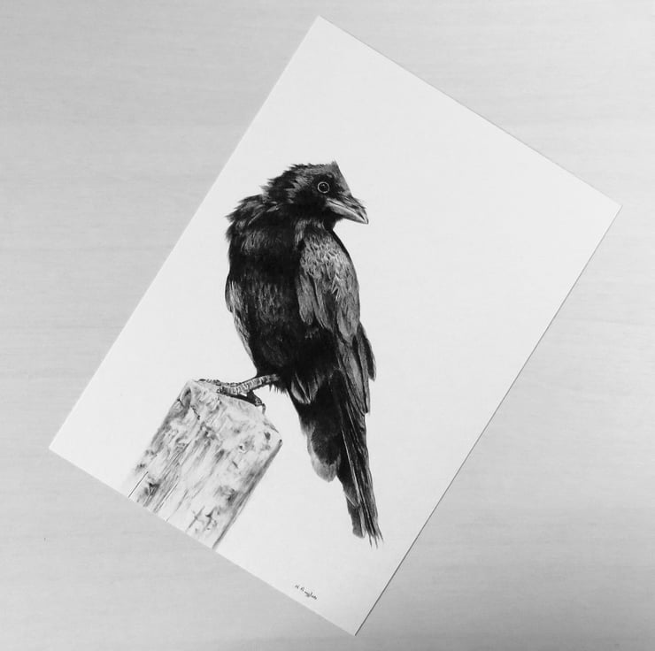 Detailed wildlife print of a lovely young crow, on quality white recycled card stock, taken from my original charcoal drawing. Juvenile crows have lighter, softer feathers than the adults, as you can see here being fluffed up by the breeze.