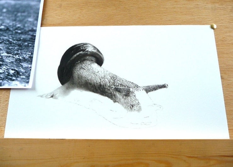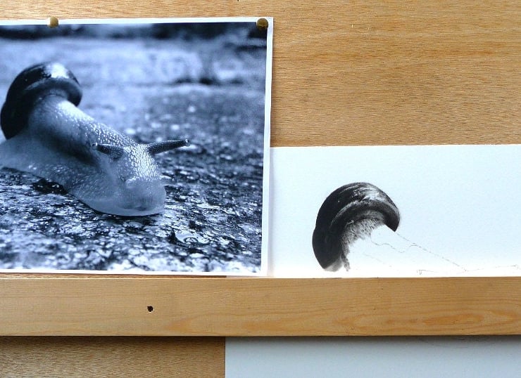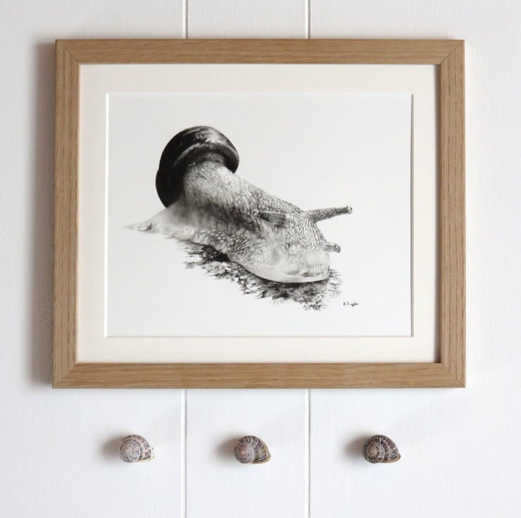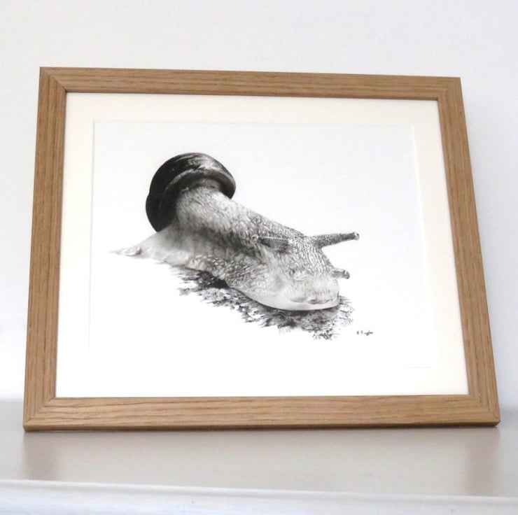 Original charcoal pencil drawing of a snail, on watercolour paper. Additional images show the work in progress. A unique portrait of often overlooked British wildlife - fantastic detail of the snails' face subtly shifts to a softer focus on the shell, giving a natural close up view.