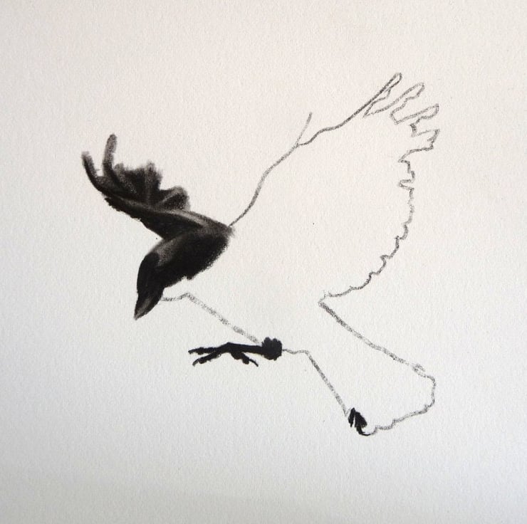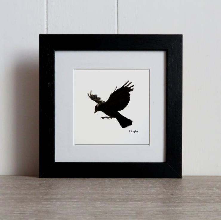 Original charcoal pencil drawing on fine art paper of a jackdaw in flight. These small framed artworks are ideal to pop on a bookshelf or telephone table, or make a murder and start a gallery wall. Additional images show the work in progress.