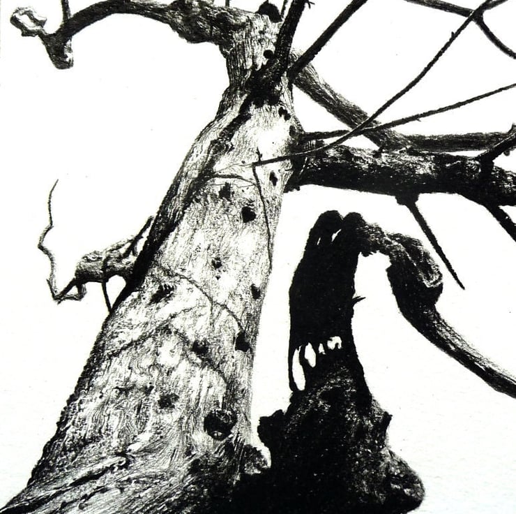 Original charcoal drawing of a tree on watercolour paper, framed in satinwood with acrylic glazing. One from the archives, this - one of the last pieces I did on textured paper. I'm offering it at a great price to make some space in the studio for my growing mob of house monsters.