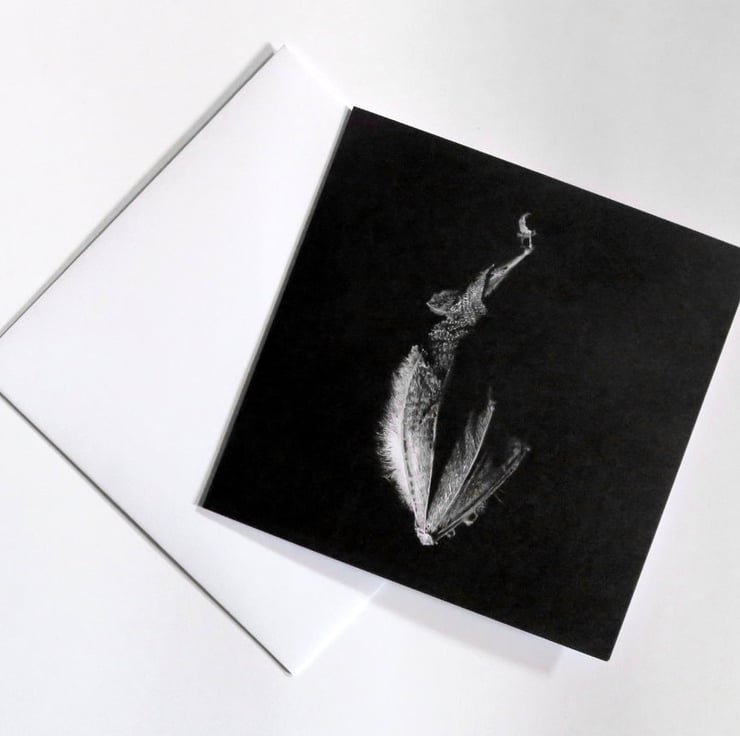 A lovely adaptation of my original sleeping bat charcoal drawing, printed on a blank card. Comes complete with white envelope and protective film bag. Frame as a mini work of wildlife art or gift to a gothic inclined friend.