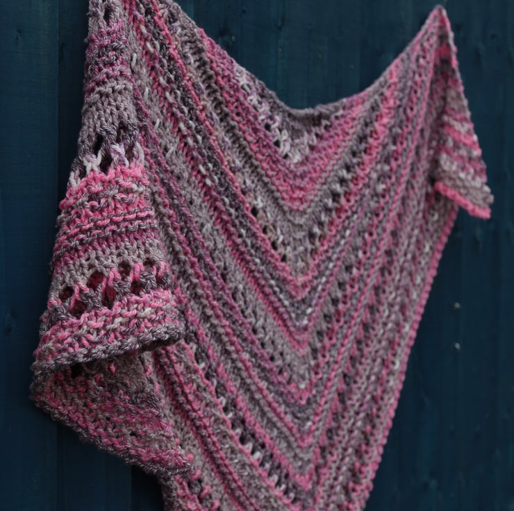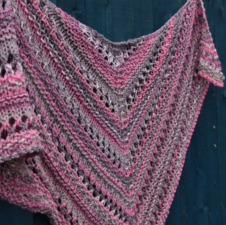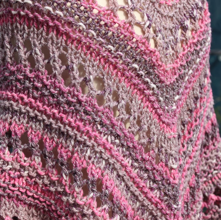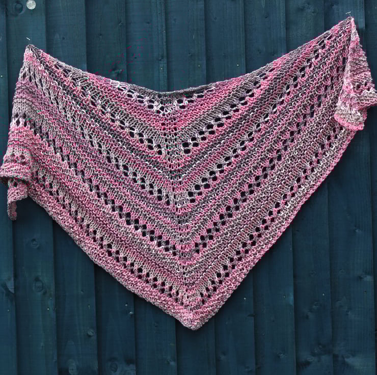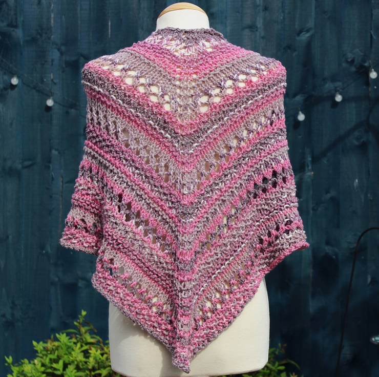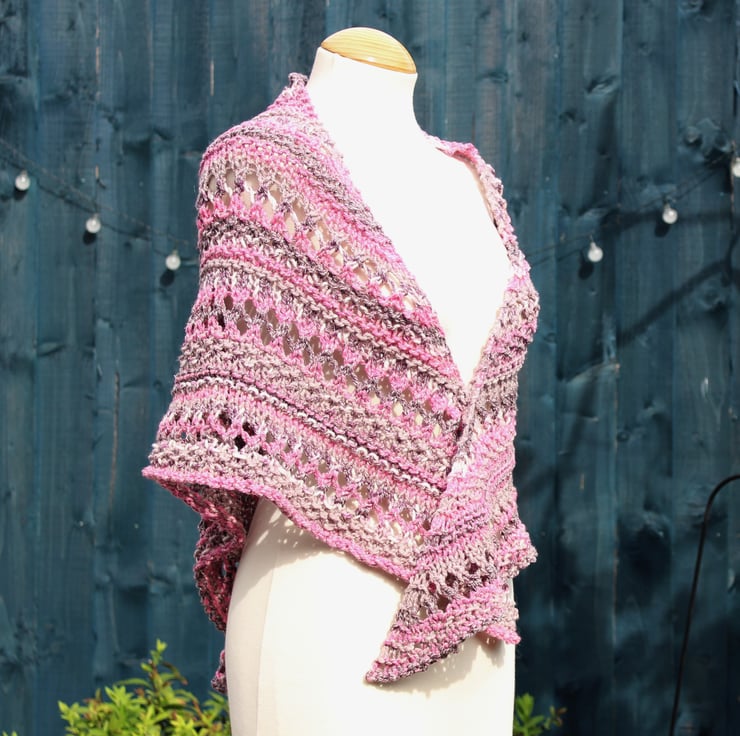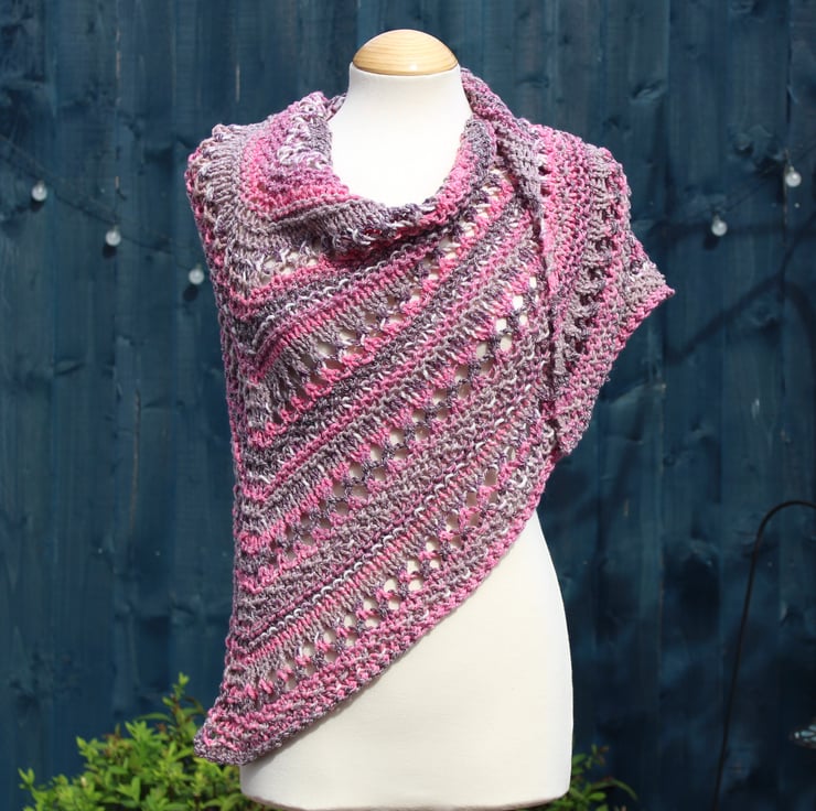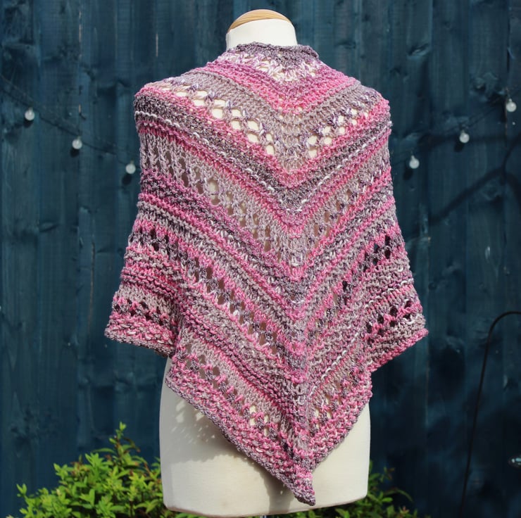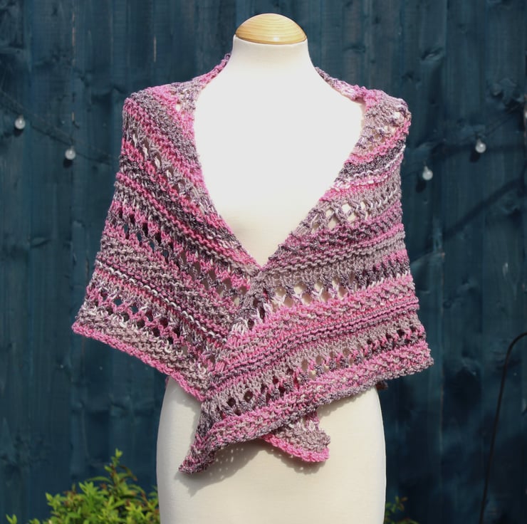 This practical shawl has been hand knit by me using a commercially produced yarn in shades of burgundy, pink, grey and white. This is a ready to ship item and you will receive the item shown in the photographs.