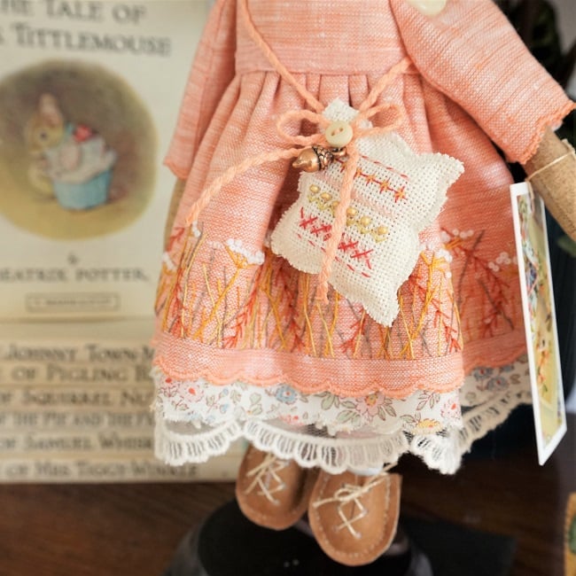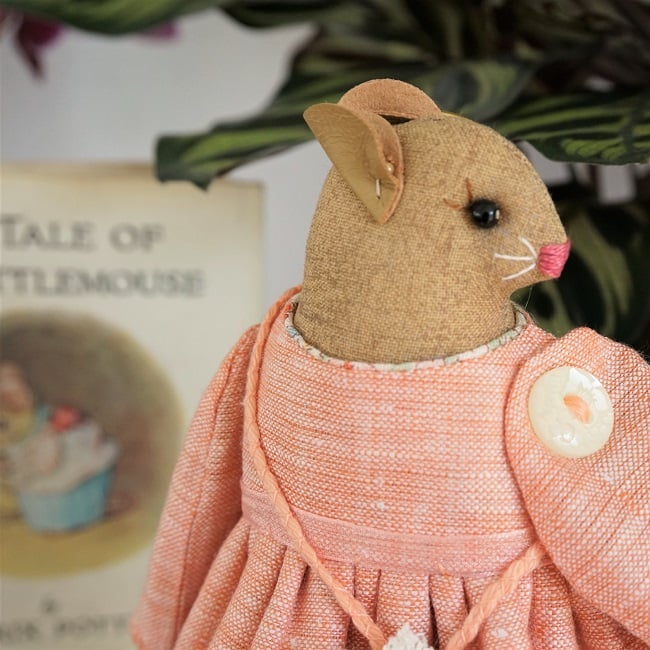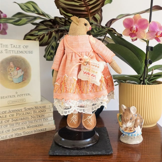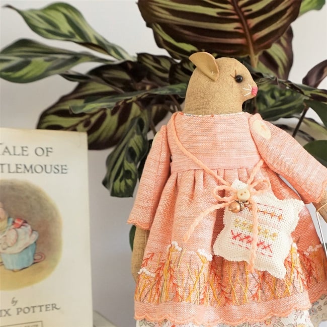 This is Meadow, a tiny brown harvest mouse. She is a hand embroidered mouse with little leather ears and tail. She is dressed in a coral linen frock with Liberty Summer Meadow print underskirt, from the Riviera Collection and a cream tulle petticoat with fetching cream lace bloomers. Her dress is hand embroidered with a late summer meadow that runs along the bottom of the skirt. Her clothing is finished with organza ribbon, tiny buttons and little leather shoes.