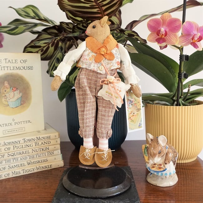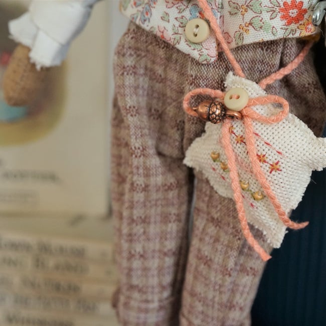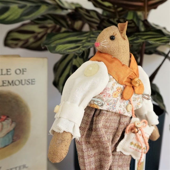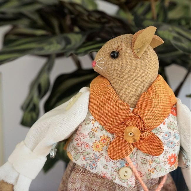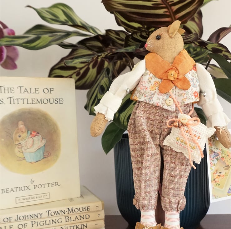 This is Mead, a tiny brown harvest mouse. He is a hand embroidered mouse with little leather ears and tail. He is dressed in tweedy fawn yarn dyed cotton plus fours with linen shirt and Liberty Lawn print cotton waistcoat from the Riviera collection called Meadow Flowers Vintage. He is finished with tiny buttons, leather shoes and a sampler on his little bag.