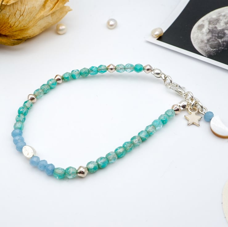 The mother of pearl crescent moon charm adds a playful touch, making this bracelet a wearable piece of celestial magic!