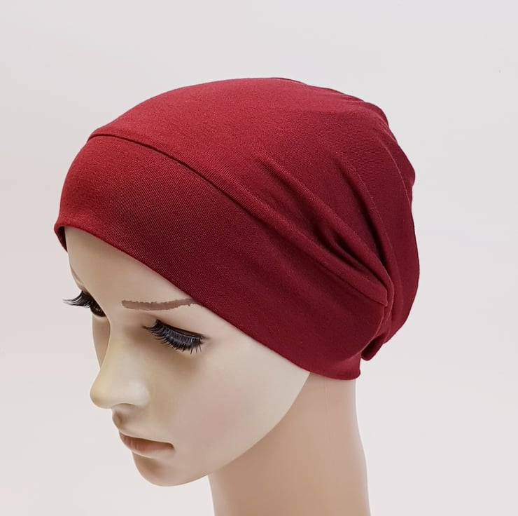 Burgundy viscose jersey chemo hat for women, breathable and lightweight beanie.