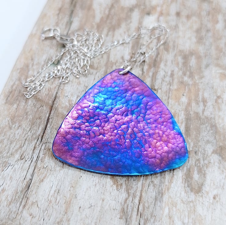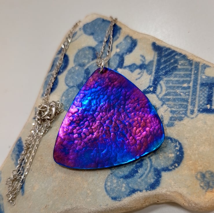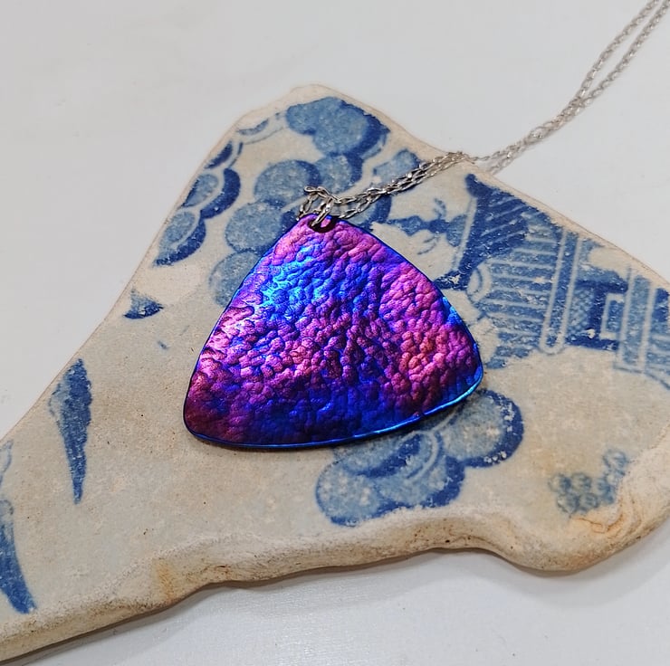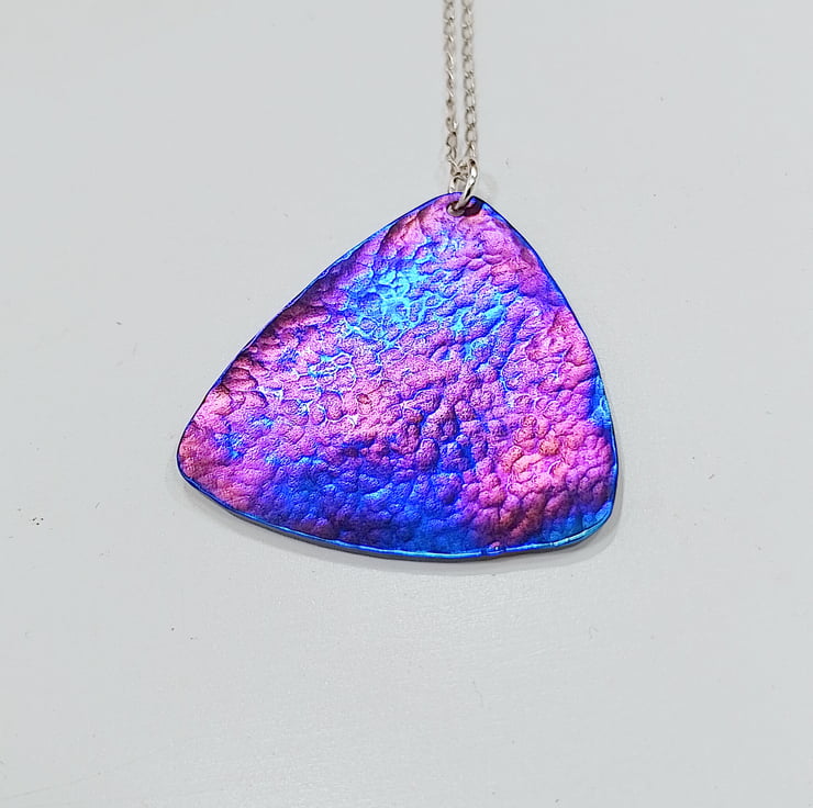 This titanium pendant necklace displays a range of attractive shades which really come to life when it catches the light.
