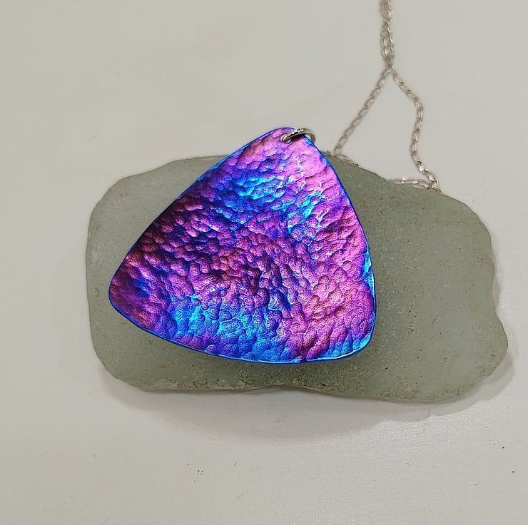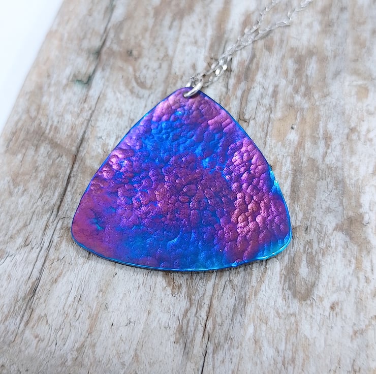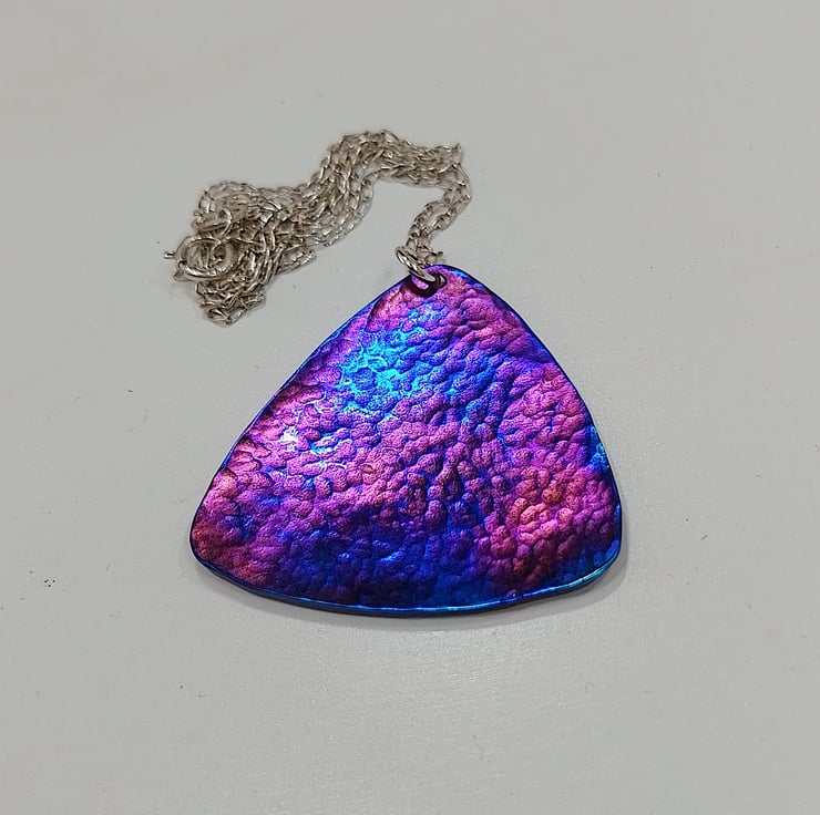 I have made this beautiful pendant by hand sawing the shape from titanium sheet. I've given the surface an attractive hammered finish to create texture and polished finish before colouring.