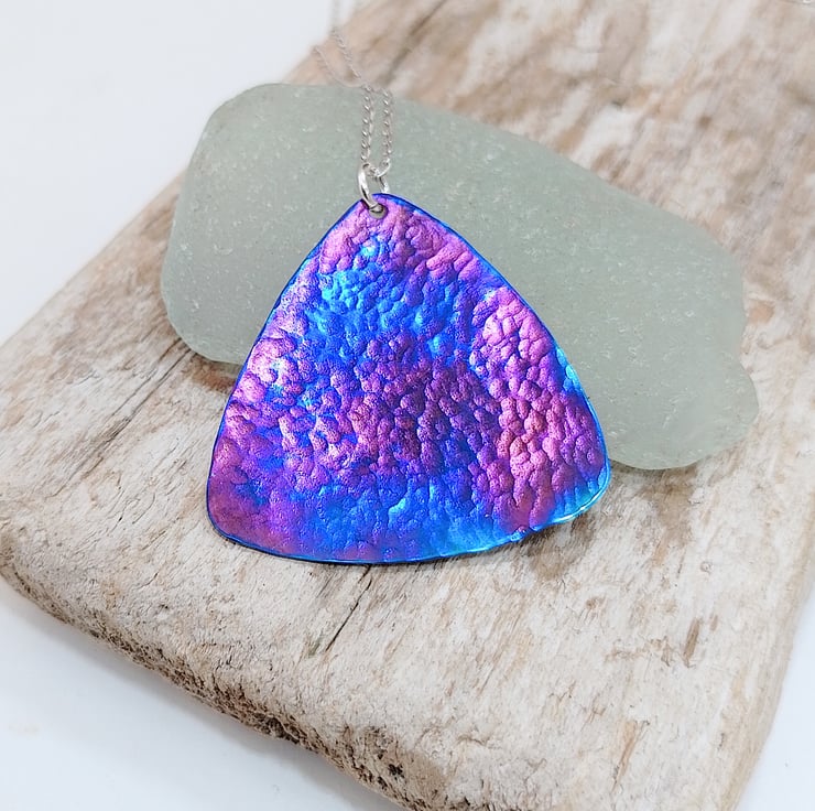 This titanium pendant necklace displays a range of attractive shades which really come to life when it catches the light.