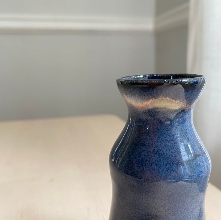 Hand made on the potters wheel and decorated in a deep dark blue with flashes of celadon and hints of pink. This vase has some fluted detail added around the base.